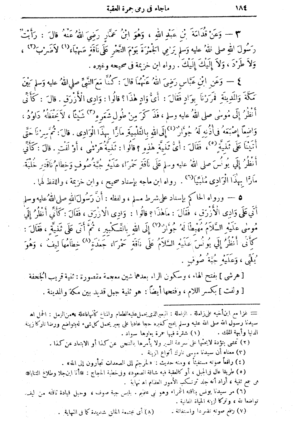 3 - وعنْ قدامة بن عبد الله، وهو ابن عمَّار رضي الله عنه قال: رأيت رسول الله صلى الله عليه وسلم يرمي الجمرة يوم النَّحر على ناقةٍ صهباء (¬1) لا ضرب (¬2)، ولا طرْد، ولا إليك إليك. رواه ابن خزيمة في صحيحه وغيره.