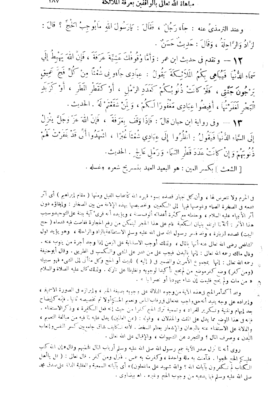 12 - وتقدم في حديث ابن عمر: وأمَّا وقوفك عشية عرفة، فإنَّ الله يهبط إلى سماء الدنيا فيباهي بكم الملائكة يقول: عبادي جاءوني شعثاً من كلِّ فجٍ عميق يرجون جنَّتي، فلوْ كانت ذنوبكم كعدد الرَّمل، أوْ كقطرِ المطر، أو كزبدِ البحر لغفرتها، أفيضوا عبادي مغفوراً لكمْ، ولمنْ شفعتمْ له. الحديث.