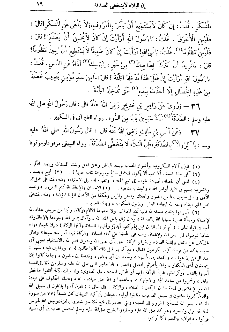 36 - ورؤى عن رافع بن خديجٍ رضي الله عنه قال: قال رسول الله صلى الله عليه وسلم: الصَّدقة (¬5) تسدٌّ سبعين باباً من السوء. رواه الطبراني في الكبير.