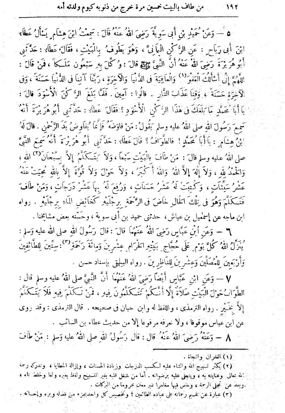5 - وعنْ حميد بن أبي سويَّة رضي الله عنه قال: سمعتُ ابن هشام يسأل عطاء ابن أبي رباحٍ: عن الرُّكن اليمانيِّ، وهو يطوف بالبيت، فقال عطاء: حدَّثني أبو هريرة رضي الله عنه أنَّ النبيِّ صلى الله عليه وسلم قال: وكل به سبعون ملكاً، فمن قال: اللهمَّ إنِّي أسألك العفو (¬1) والعافية في الدنيا والآخرة، ربنا آتنا في الدنيا حسنة، وفي الآخرة حسنة، وقنا عذاب النَّار. قالوا: آمين: فلمَّا بلغ الرُّكن الأسود قال: يا أبا محمَّدٍ ما بلغك في هذا الرُّكن الأسود؟ فقال عطاء: حدثني أبو هريرة أنه سمع رسول الله صلى الله عليه وسلم ييقول: من فاوضه فإنما يفاوض يد الرحمن. قال له ابن هشامٍ: يا أبا محمدٍ! فالطواف؟ قال عطاء: حدثني أبو هريرة أنه سمع النبيَّ صلى الله عليه وسلم: من طاف بالبيت سبعاً، ولا يتكلم إلا بسبحان (¬2) الله، والحمد لله، ولا إله إلا الله والله أكبر، ولا حول ولا قوة إلا بالله محيتْ عنهُ عشر سيئاتِ، وكتبت له عشرُ حسناتٍ، ورفع له بها عشر درجاتٍ، ومن طاف فتكلم وهو في تلك الحال خاض في الرحمة برجليه كخائض الماء برجليه. رواه ابن ماجه عن إسماعيل بن عياش، حدثني حميد بن أبي سوية، وحسَّنه بعض مشايخنا.