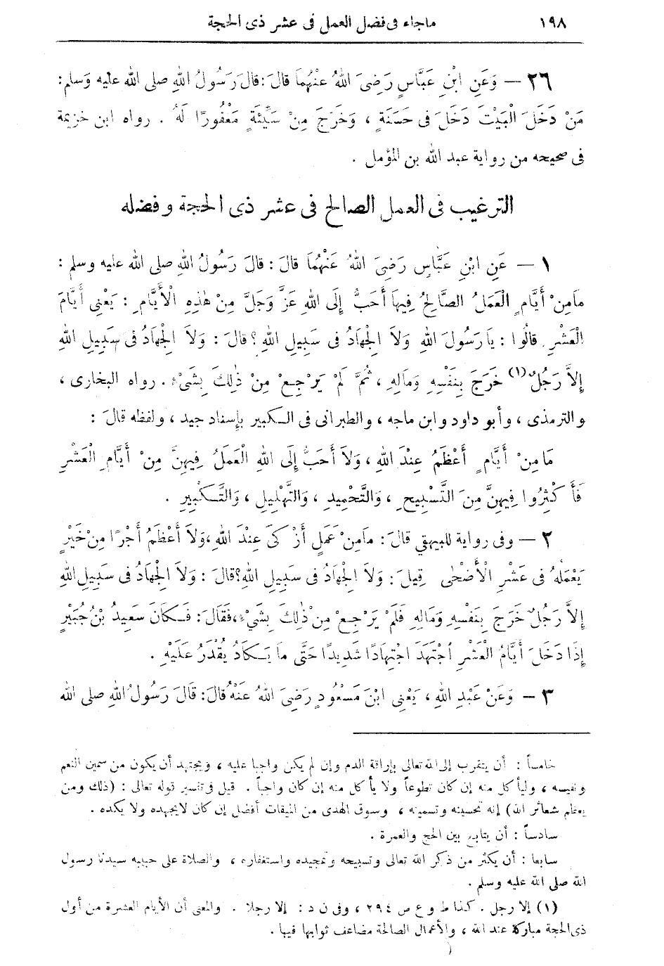 1 - عن ابن عباسٍ رضي الله عنهما قال: قال رسول الله صلى الله عليه وسلم: ما منْ أيامٍ العمل الصالح فيها أحبُّ إلى الله عزَّ وجلَّ: من هذه الأيام. يعني أيَّام العشر قالوا يا رسول الله: ولا الجهاد في سبيل الله؟ قال: ولا الجهاد في سبيل الله إلا رجلٌ (¬1) خرج بنفسهِ وما لهِ، ثمَّ لمْ يرجعْ من ذلك بشيء. رواه البخاري والترمذي، وأبو داود وابن ماجه، والطبراني في الكبير بإسناد جيد، ولفظه قال: