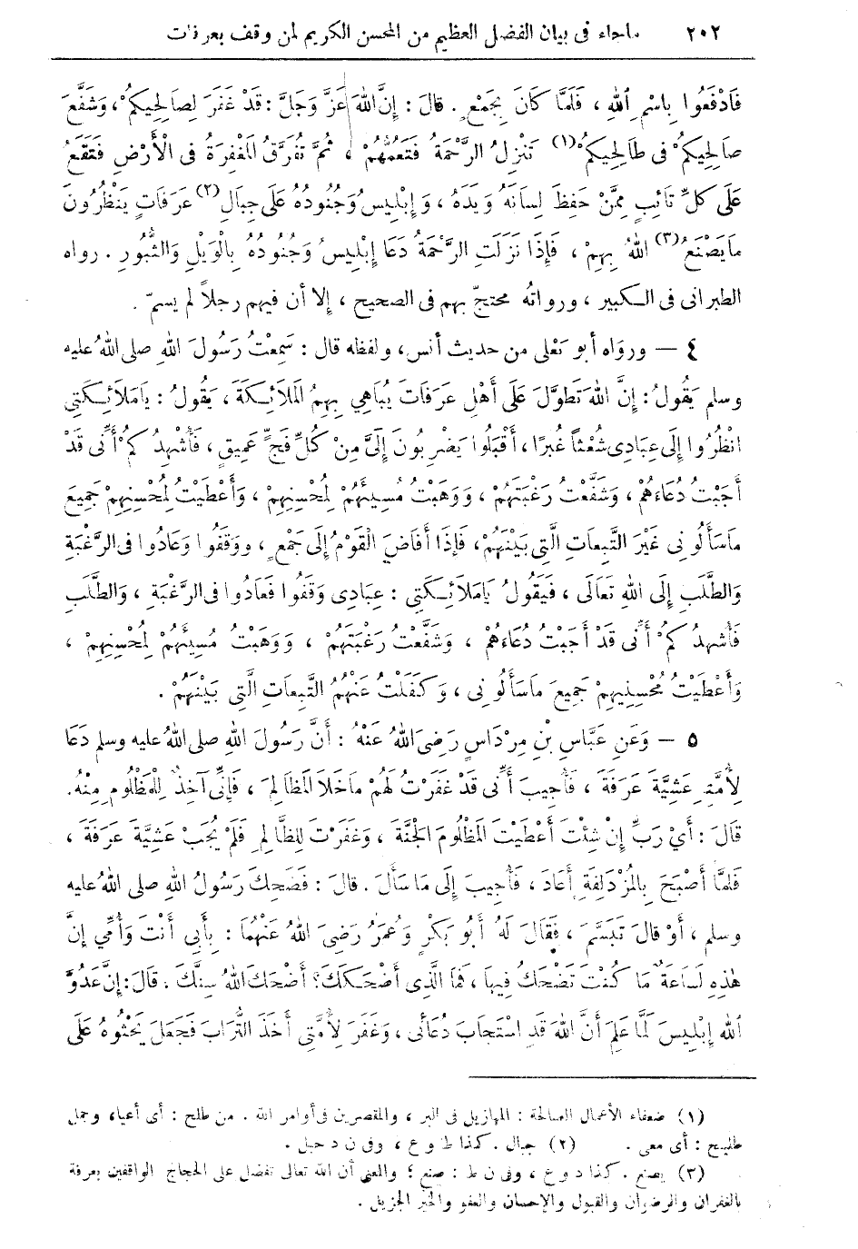 4 - ورواه أبو يعلي من حديث أنس، ولفظه قال: سمعتُ رسول الله صلى الله عليه وسلم يقول: إنَّ الله تطوَّل على أهل عرفات يباهي بهم الملائكة، يقول: يا ملائكتي انظروا إلى عبادي شعثاً غبراً، أقبلوا يضربون إليَّ من كلِّ فجٍّ عميق، فأشْهد كمْ أنِّي قد أجبت دعاءهمْ، وشفَّعتُ رغبتهمْ، ووهبت مسيئهمْ لمحسنهمْ، وأعطيت لمحسنهم جميع ما سألوني غير التَّبعات التي بينهمْ، فإذا أفاض القوم إلى جمعٍ، ووقفوا وعادوا في الرَّغبة والطلب إلى الله تعالى، فيقول يا ملائكتي: عبادي وقفوا فعادوا في الرَّغبة، والطلب فأشهدكمْ أنِّي قد أجبت دعاءهمْ، وشفَّعْتُ رغبتهمْ، ووهبتُ مسيئهم لمحسنهمْ، وأعْطيتُ محسنيهمْ جميع ما سألوني، وكفلتُ عنهم التَّبعات التي بينهمْ.
