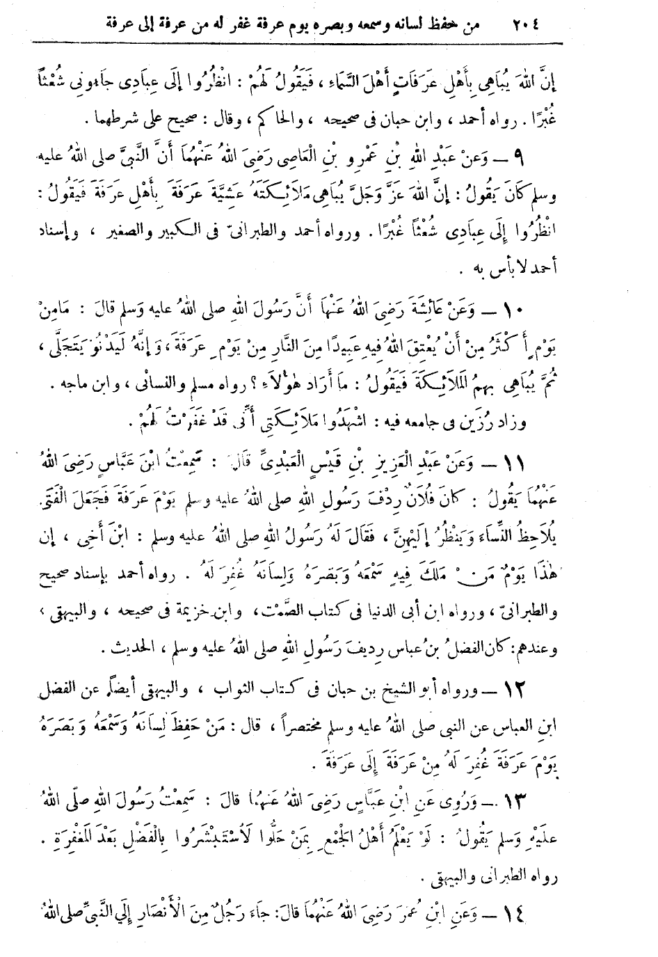 9 - وعنْ عبد الله بن عمرو بن العاصي رضي الله عنهما أنَّ النبيَّ صلى الله عليه وسلم كان يقول: إنَّ الله عزَّ وجلَّ يباهي ملائكته عشيَّة عرفة بأهل عرفة فيقول: انظروا إلى عبادي شعْثاً غبراً. ورواه أحمد الطبراني في الكبير والصغير، وإسناد أحمد لا بأس به.