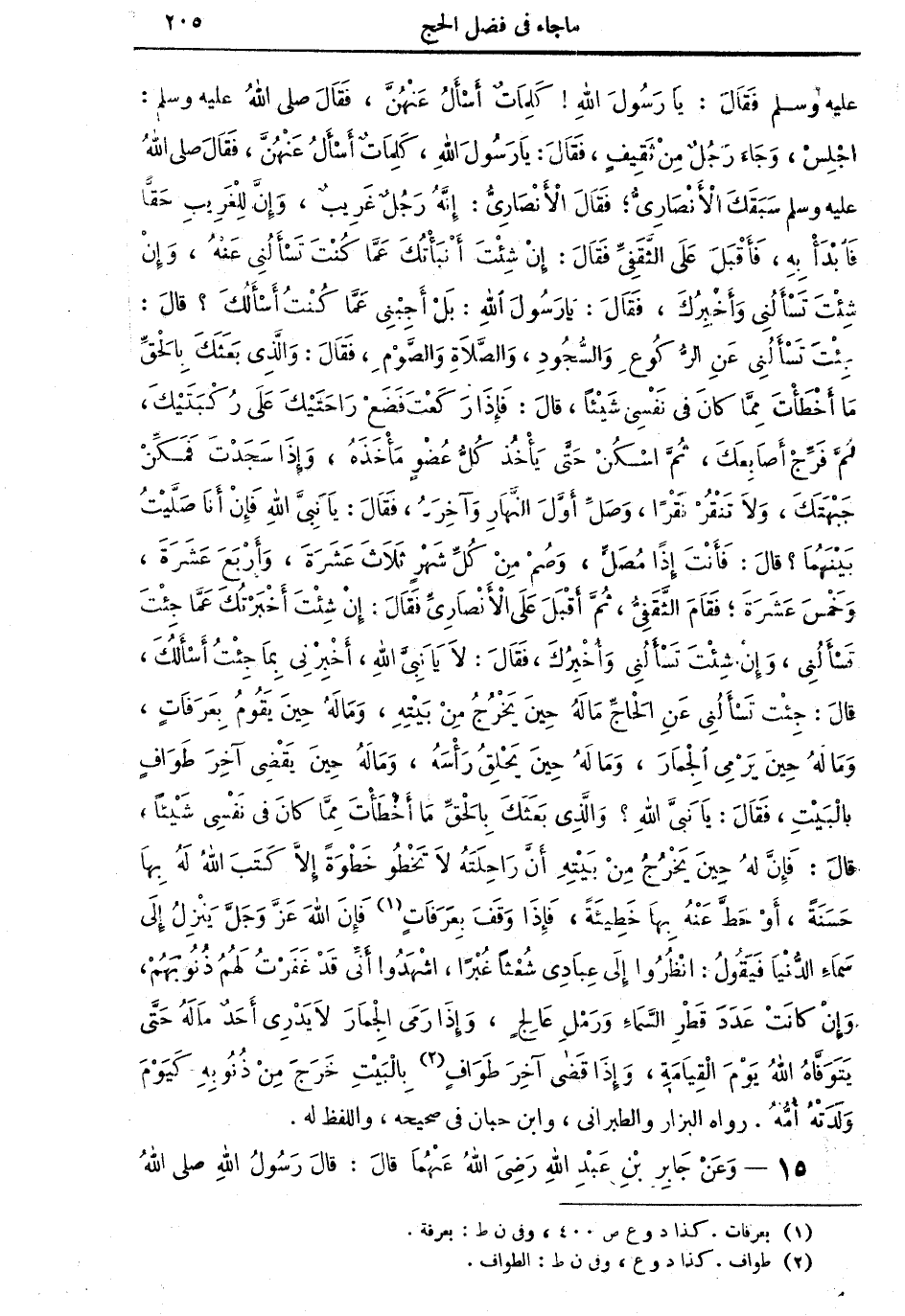يا رسول الله! كلمات أسأل عنهنَّ، فقال صلى الله عليه وسلم: اجْلسْ، وجاء رجلٌ من ثقيفٍ، فقال: يا رسول الله، كلمات أسأل عنهنَّ، فقال صلى الله عليه وسلم: سبقك الأنصاريُّ، فقال الأنصاريُّ: إنَّه رجل غريب، وإن للغريب حقا فابدأ بهِ، فأقبل على الثَّقفي فقال: إن شئتَ أنبأتك عمَّا كنْتَ تسألني عنهُ، وإنْ شئت تسألني عن الركوع والسجود، والصلاة والصوم، فقال: والذي بعثك بالحقِّ ما أخطأتِ مما كان في نفسي شيئاً، قال: فإذا ركعتَ فضعْ راحتيك على ركبتيك، ثمَّ فرِّج أصابعك، ثمَّ اسكنْ حتى يأخذ كلُّ عضو مأخذه، وإذا سجدت فمكِّنْ جبهتك، ولا تنقر نقراً، وصلِّ أوَّل النهار وآخره، فقال: يا نبي الله فإن أنا صلَّيت بينهما؟ قال: فأنت إذاً مصلٍ، وصمْ من كل شهر ثلاث عشرة، وأربع عشرة، وخمس عشرة، فقام الثقفي، ثمَّ أقبل على الأنصاري فقال: إن شئت أخبرتك عمَّا جئت تسألني، وإن شئت تسألني وأخبرك، فقال: لا يا نبيَّ الله، أخبرني بما جئت أسألك، قال: جئت تسألني عن الحاجِّ ماله حين يخرج من بيتهِ، وماله حين يقوم بعرفاتٍ، وما له حين يرمي الجمار، وما له حين يحلق رأسه، وما له حين يقضي آخر طوافٍ بالبيت، فقال: يا نبي الله! والذي بعثك بالحق ما أخطأت مما كان في نفسي شيئاً، قال: فإنَّ له حين يخرج من بيته أن راحلته لا تخطو خطوةً إلا كتب الله له بها حسنً، أوْ حطَّ عنها بها خطيئةً، فإذا وقف بعرفاتٍ (¬1) فإنَّ الله عزَّ وجلَّ ينزل إلى سماء الدنيا فيقول: انظروا إلى عبادي شعثاً غبراً، اشهدوا أنِّي قدْ غفرتُ لهم ذنوبهمْ، وإنْ كانت عدد قطر السَّماء ورمل عالجٍ، وإذا رمى الجمار لا يدري أحد ماله حتى يتوفَّاه الله يوم القيامةِ، وإذا قضى آخر طوافٍ (¬2)