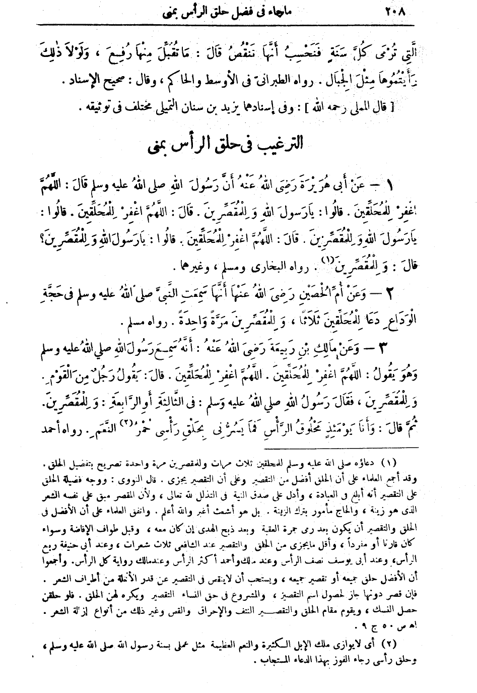 1 - عنْ أبي هريرة رضي الله عنه أنَّ رسول الله صلى الله عليه وسلم قال: اللهمَّ اغفر للمحلِّقين. قالوا: يا رسول الله وللمقصرين. قال: اللهمَّ اغفر للمحلقين. قالوا: يا رسول الله وللمقصرين. قال: اللهمَّ اغفرْ للمحلقين. قالوا: يا رسول الله وللمقصرين؟ قال: وللمقصرين (¬1). رواه البخاري، ومسلم، وغيرهما.