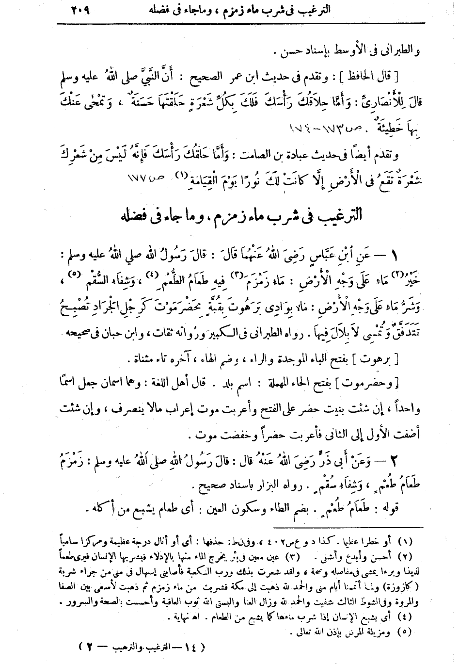 1 - عن ابن عباس رضي الله عنهما قال: قال رسول الله صلى الله عليه وسلم: خير (¬2) ما على وجه الأرض: ماء زمزم (¬3) فيه طعام الطُّعمِ (¬4)، وشفاء السُّقم (¬5)، وشرُّ ماء على وجه الأرض: ماء بوادي برهوت بقيَّةٍ بحضرموت كرجل الجراد تصبح تتدفَّق وتمسى لا بلال فيها. رواه الطبراني في الكبير ورواته ثقات، وابن حبان في صحيحه.