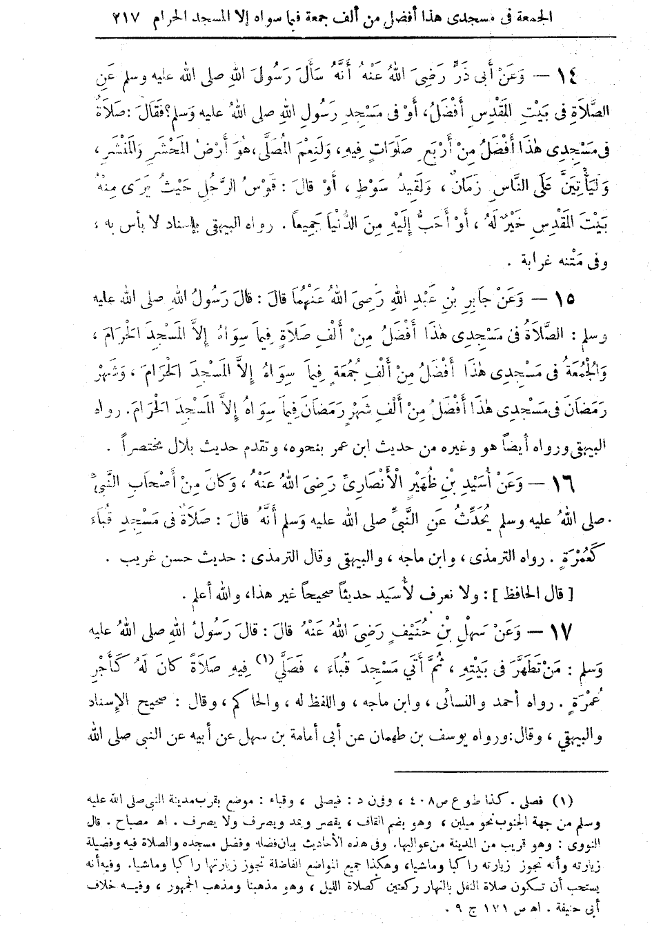 14 - وعنْ أبي ذرٍ رضي الله عنه أنه سأل رسول الله صلى الله عليه وسلم عن الصلاة في بيت المقدس أفضل، أو في مسجد رسول الله صلى الله عليه وسلم؟ فقال: صلاة في مسجدي هذا أفضل من أربع صلواتٍ، ولنعمَ المصلي، هو أرض المحشرِ والمنشرِ، وليأتينَّ على الناس زمان، ولقيد سوطٍ، أو قال: قوس الرَّجل حيث يرى منه بيت المقدس خير له، أو أحبُّ إليه من الدنيا جميعاً. رواه البيهقي بإسناد لا بأس به. وفي متْنه غرابة.