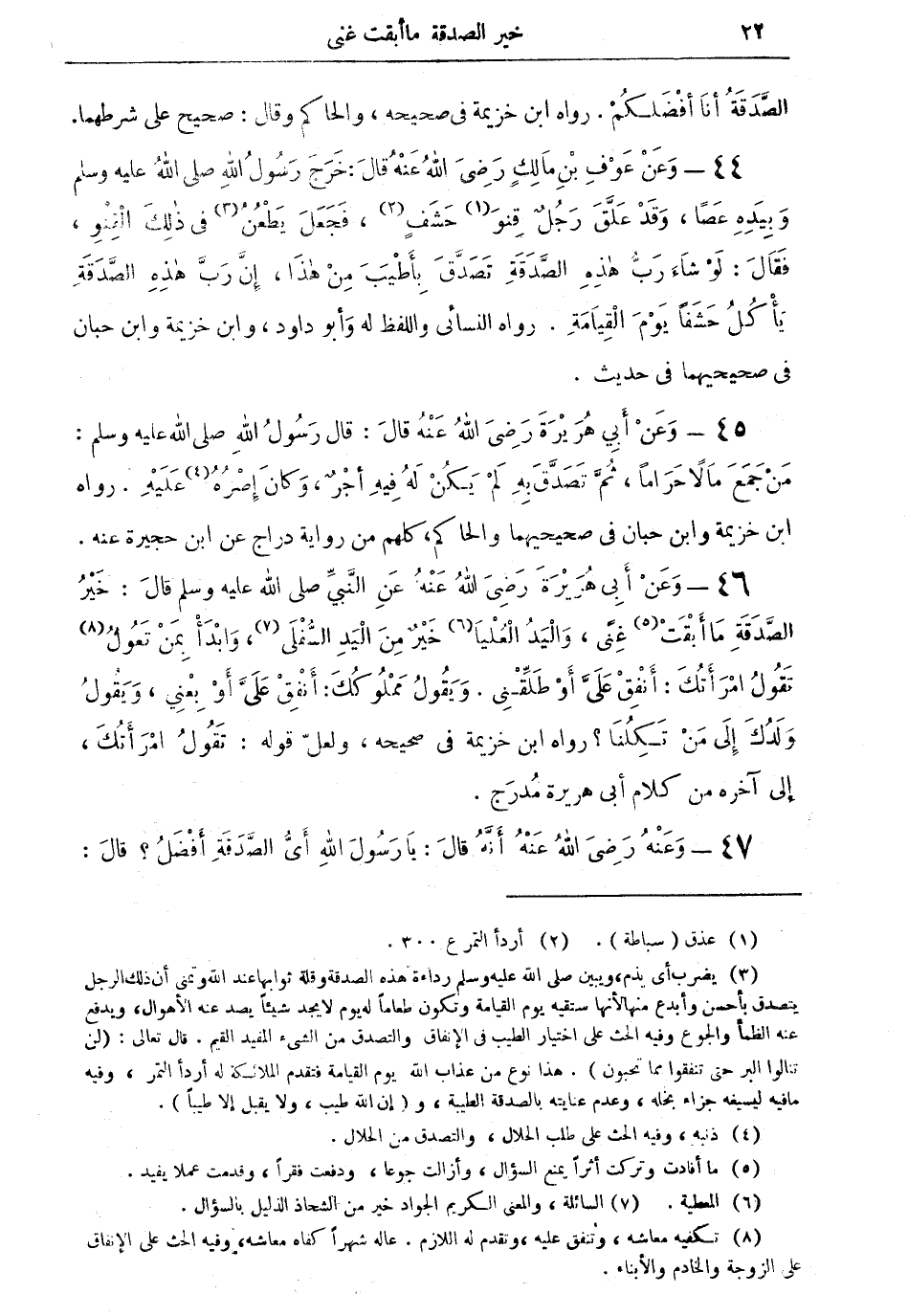 44 - وعنْ عوف بن مالكٍ رضي الله عنه قال: خرج رسول الله صلى الله عليه وسلم وبيده عصاً، وقدْ علَّق رجل قنْو (¬1) حشفٍ (¬2)، فجعل يطعن (¬3) في ذلك القنو، فقال: لو شاء رب هذه الصَّدقة تصدَّق بأطيب من هذا، إنَّ ربَّ هذه الصَّدقة يأكل حشفاً يوم القيامة. رواه النسائي واللفظ له، وأبو داود، وابن خزيمة، وابن حبان في صحيحهما في حديث.