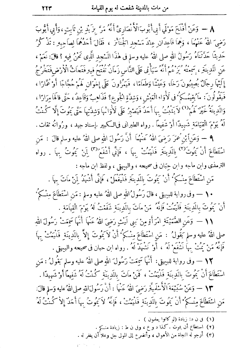 12 - وفي رواية للبيهقي: أنَّها سمعت رسول الله صلى الله عليه وسلم يقول: من استطاع أن يموت بالمدينة فليمتْ، فمن مات بالمدينة كنتُ له شفيعاً أو شهيداً.