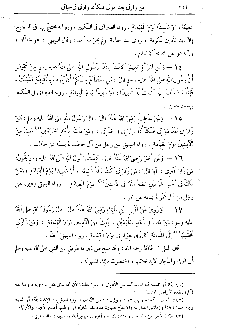 15 - وعنْ حاطبٍ رضي الله عنه قال: قال رسول الله صلى الله عليه وسلم: منْ زارني بعد موتي فكأنَّما زارني في حياتي، ومن مات بأحد الحرمين (¬1) بُثَ من الآمنين يوم القيامة: رواه البيهقي عن رجل من آل حاطب له يسمه عن حاطب.