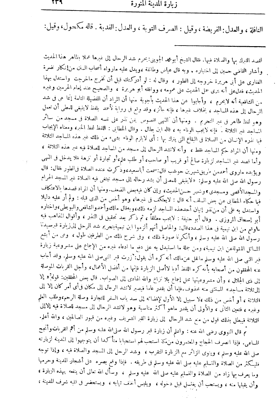 = لقصد التبرك بها والصلاة فيها. فقال الشيخ أبو محمد الجويني: يحرم شد الرحال إلى غيرها عملا بظاهر هذا الحديث وأشار القاضي حسين إلى اختياره، وبه قال عياض وطائفة، ويدل عليه ما رواه أصحاب السنن من إنكار نضرة الغفاري على أبي هريرة خروجه إلى الطور، وقال له لو أدركت قبل أن تخرج ما خرجت، واستدل بهذا الحديث فدل على أنه يرى حمل الحديث على عمومه، ووافقه أبو هريرة، والصحيح عند إمام الحرمين وغيره من الشافعية أنه لا يحرم، وأجابوا عن هذا الحديث بأجوبة منها أن المراد أن الفضيلة التامة إنما هي في شد الرحال إلى هذه المساجد، بخلاف غيرها، فإنه جائز، وقد وقع في رواية لأحمد بلفظ لا ينبغي للمعطي أن تعمل وهو لفظ ظاهر في غير التحريم. ومنها أن النهي مخصوص بمن نذر على نفسه الصلاة في مسجد من سائر المساجد غير الثلاثة. فإنه لا يجب الوفاء به. قاله ابن بطال، وقال الخطابي: اللفظ لفظ الخبر، ومعناه الإيجاب فيما نذره الإنسان من الصلاة في البقاع التي يتبرك بها. أي لا يلزم الوفاء بشيء من ذلك غير هذه المساجد الثلاثة. ومنها أن المراد حكم المساجد فقط، وأنه لا تشد الرحال إلى مسجد من المساجد للصلاة فيه غير هذه الثلاثة، وأما قصد غير المساجد لزيارة صالح أو قريب أو صاحب، أو طلب علم، أو تجارة أو نزهة فلا يدخل في النهي ويؤيده ما روي أحمد من طريق شهر بن حوشب قال: سمعت أبا سعيد، وذكرت عنده الصلاة في الطور فقال قال رسول الله صلى الله عليه وسلم: (لا ينبغي للمصلي أن يشد رحاله إلى مسجد تبتغي فيه الصلاة غير المسجد الحرام، والمسجد الأقصى ومسجدي) وشهر حسن الحديث، وإن كان فيه بعض الضعف. ومنها أن المراد قصدها بالاعتكاف فيما حكاة الخطابي عن بعض السلف أنه قال: لا يعتكف في غيرها، وهو أخص من الذي قبله: ولم أر عليه دليلا واستدل به على أن من نذر إتيان أحد هذه المساجد لزمه ذلك، وبه قال مالك وأحمد الشافعي والبويطي، واختاره أبو إسحاق المروزي، وقال أبو حنيفة: لا يجب مطلقاً، ثم ذكر بعد تحقيق في النذر، وأقوال المذاهب فيه ما وقع من ابن تيمية، ومن جملة ما استدل به على دفع ما ادعاء غبره من الإجماع على مشروعية زيارة قبر النبي صلى الله عليه وسلم ما نقل من مالك أنه كره أن يقول: زرت قبر النبي صلى الله عليه وسلم. وقد أجاب عنه المحققون من أصحابه بأنه كره اللفظ أدبا لا أصل الزيارة فإنها من أفضل الأعمال، وأجل القربات الموصلة إلى ذي الجلال، وأن مشروعيتها محل إجماع بلا نزاع والله الهادي إلى الصواب. قال بعض المحققين قوله: إلا إلى ثلاثة مساجد المستثنى منه محذوف. فأما أن يقدر عاما فيصير لا تشد الرحال إلى مكان في أي أمر كان إلا إلى الثلاثة، أو أخص من ذلك، لا سبيل إلى الأول لإفضائه إلى سد باب السفر للتجارة وصلة الرحم، وطلب العلم وغيره، فتعين الثاني، والأولى أن يقدر ما هو أكثر مناسبة وهو لا تشد الرحال إلى مسجد للصلاة فيه إلا إلى الثاثة فيبطل بذلك قول من منع شد الرحال إلى زيارة القبر الشريف وغيره من قبور الصالحين، والله أعلم.