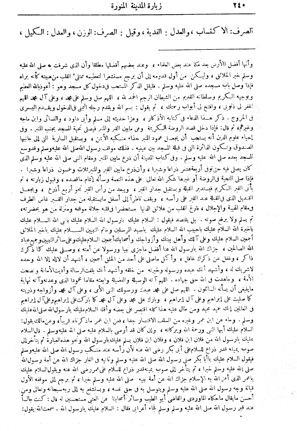 = وأنها أفضل الأرض بعد مكة عند بعض العلماء، وعند بعضهم أفضلها مطلقا، وأن الذي شرفت به صلى الله عليه وسلم خير الخلائق، وليكن من أول قدومه إلى أن يرجع مستشعرا لتعظيمه ممتلئ القلب من هيبته كأنه يراه فإذا وصل باب مسجده صلى الله عليه وسلم. فليقل الذكر المستحب في دخول كل مسجد، وهو: أعوذ بالله العظيم وبوجهه الكريم، وسلطانه القديم من الشيطان الرجيم الحمد لله، اللهم صل وسلم على محمد، وعلى آل محمد، اللهم اغفر لي ذنوبي، وافتح لي أبواب رحمتك، ثم يقول: بسم الله ويقدم رجله اليمنى في الدخول ويقدم اليسرى في الخروج. ذكر هذا الدعاء في كتابه الأذكار، وعزا حديثه إلى مسلم وأبي داود، والنسائي وابن ماجه وغيرهم، ثم قال: فإذا دخل قصد الروضة الكريمة وهي ما بين القبر والمنبر فيصلى تحية المسجد بجنب المنبر. وفي إحياء علوم الدين أنه يستحب أن يجعل عمود المنبر حذاء منكبه الأيمن، ويستقبل السارية التي إلى جانبها الصندوق وتكون الدائرة التي في قبلة المسجد بين عينيه. فذلك موقف رسول الله صلى الله عليه وسلم، وقد وسع المسجد بعده صلى الله عليه وسلم. وفي كتاب المدينة أن ذرع ما بين المنبر ومقام النبي صلى الله عليه وسلم الذي كان يصلي فيه حتى توفي أربعة عشر ذراعا وشبرا، وأن ذرع ما بين القبر والمنبر ثلاثة وخمسون ذراعا وشبرا فإذا صلى التحية في الروضة أو غ يرها شكر الله تعالى على هذه النعمة وسأله إتمام ما قصده، وقبول زيارته، ثم يأتي القبر الكريم فيستدبر القبلة ويستقبل جدار القبر، ويبعد من رأس القبر نحو أربع أذرع، ويجعل القنديل الذي في القبلة عند القبر على رأسه، ويقف ناظراً إلى أسفل ما يستقبله من جدار القبر غاض الطرف في مقام الهيبة والإجلال، فارغ القلب من علائق الدنيا، مستحضرا في قلبه جلالة موقفه ومنزلة من هو بحضرته، ثم يسلم ولا يرفع صوته. بل يقتصد فيقول: السلام عليك يا رسول الله السلام عليك يا نبي الله السلام عليك يا خيرة الله السلام عليك يا حبيب الله السلام عليك يا سيد المرسلين وخاتم النبيين السلام عليك يا خير الخلائق أجمعين السلام عليك وعلى آلك وأهل بيتك وأزاجك وأصحابك أجمعين السلام عليك وعلى سائر النبيين وجميع عباد الله الصالحين، جزاك الله يا رسول الله عنها أفضل ما جزى نبيا ورسولا عن أمته، وصل عليك كلما ذكرك ذاكر، وغفل عن ذكرك غافل، وأكمل ما صلى على أحد من الخلق أجمعين، أشهد أن لا إله إلا الله وحده لا شريك له، وأشهد أنك عبده ورسوله وخيرته من خلقه، وأشهد أنك بلغت الرسالة وأديت الأمانة ونصحت الأمة، وجاهدت في الله حق جهاده. اللهم آته الوسيلة والفضيلة وابعثه مقاما محمود الذي وعدته وآته نهاية ما ينبغي أن يسأله السائلون. اللهم صل على محمد عبدك ورسولك النبي الأمي، وعلى آل محمد وأزواجه وذريته كما صليت على إبراهيم وعلى آل إبراهيم، وبارك على محمد وعلى آل محمد كما باركت على إبراهيم وعلى آل إبراهيم في العالمين إنك حميد مجيد، ومن طال عليه هذا كله اقتصر على بعضه، وأقله السلام عليك يا رسول الله صلى الله عليه وسلم. وجاء عن ابن عمر وغيره من السلف الاقتصار جدا، فعن ابن عمر ما ذكرناه قريباً، وعن مالك يقول: السلام عليك أيها النبي ورحمة الله وبركاته، وإن كان قد أوصى بالسلام عليه صلى الله عليه وسلم. قال السلام عليك يا رسول الله من فلان ابن فلان، وفلان بن فلان يسلم عليك يا رسول الله ونحو هذه العبارة، ثم يتأخر إلى صوب يمينه قدر ذراع للسلام على أبي بكر رضي الله عنه لأن رأسه عند منكب رسول الله صلى الله عليه وسلم فيقول السلام عليك يا أبا بكر صفى رسول الله صلى الله عليه وسلم وثانيه في الغار جزاك الله عن أمة رسول الله صلى الله عليه وسلم خيرا، ثم يتأخر إلى صوب يمينه قدر ذراع للسلام على عمر رضي الله عنه، ويقول السلام عليك يا عمر الذي أعز الله به الإسلام جزاك الله عن أمة نبيه صلى الله عليه وسلم خيرا، ثم يرجع إلى موقفه الأول قبالة وجه رسول الله صلى الله عليه وسلم ويتوسل به في حق نفسه، ويستشفع به إلى ربه سبحانه وتعالى، ومن أحسن ما يقال ما حكاه ا