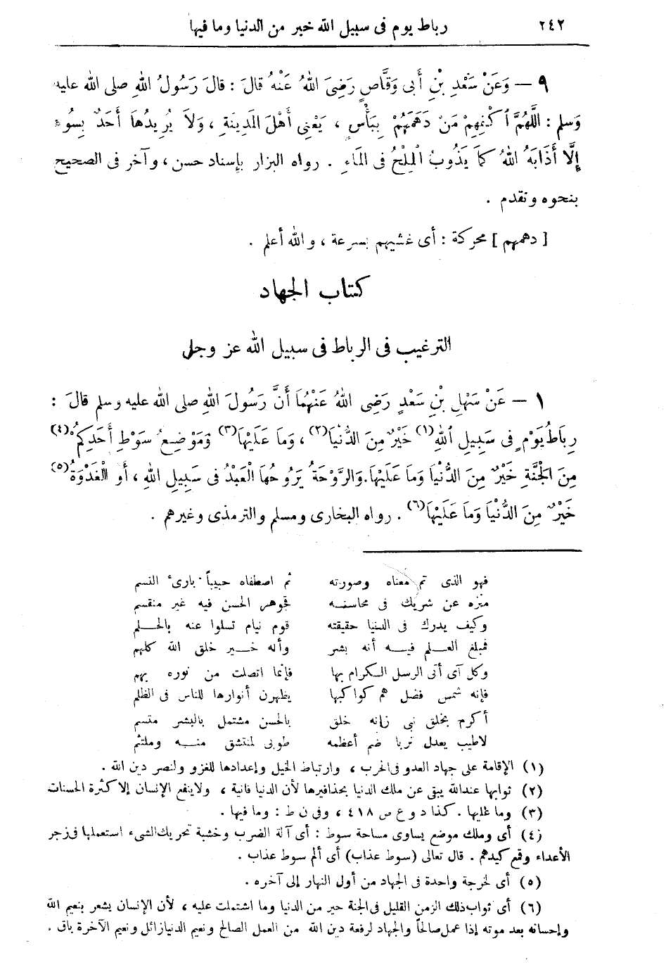 1 - وعنْ سهلِ بن سعدٍ رضي الله عنهما أنَّ رسول الله صلى الله عليه وسلم قال: رباط يومٍ في سبيل الله (¬1) خير من الدنيا (¬2)، وما عليها (¬3)، وموضع سوط أحدكم (¬4) من الجنَّة خير من الدنيا وما عليها. والرَّوْحة يروحها العبد في سبيل الله، أو الغدوة (¬5) خير من الدنيا وما عليها (¬6). رواه البخاري ومسلم والترمذي وغيرهم.