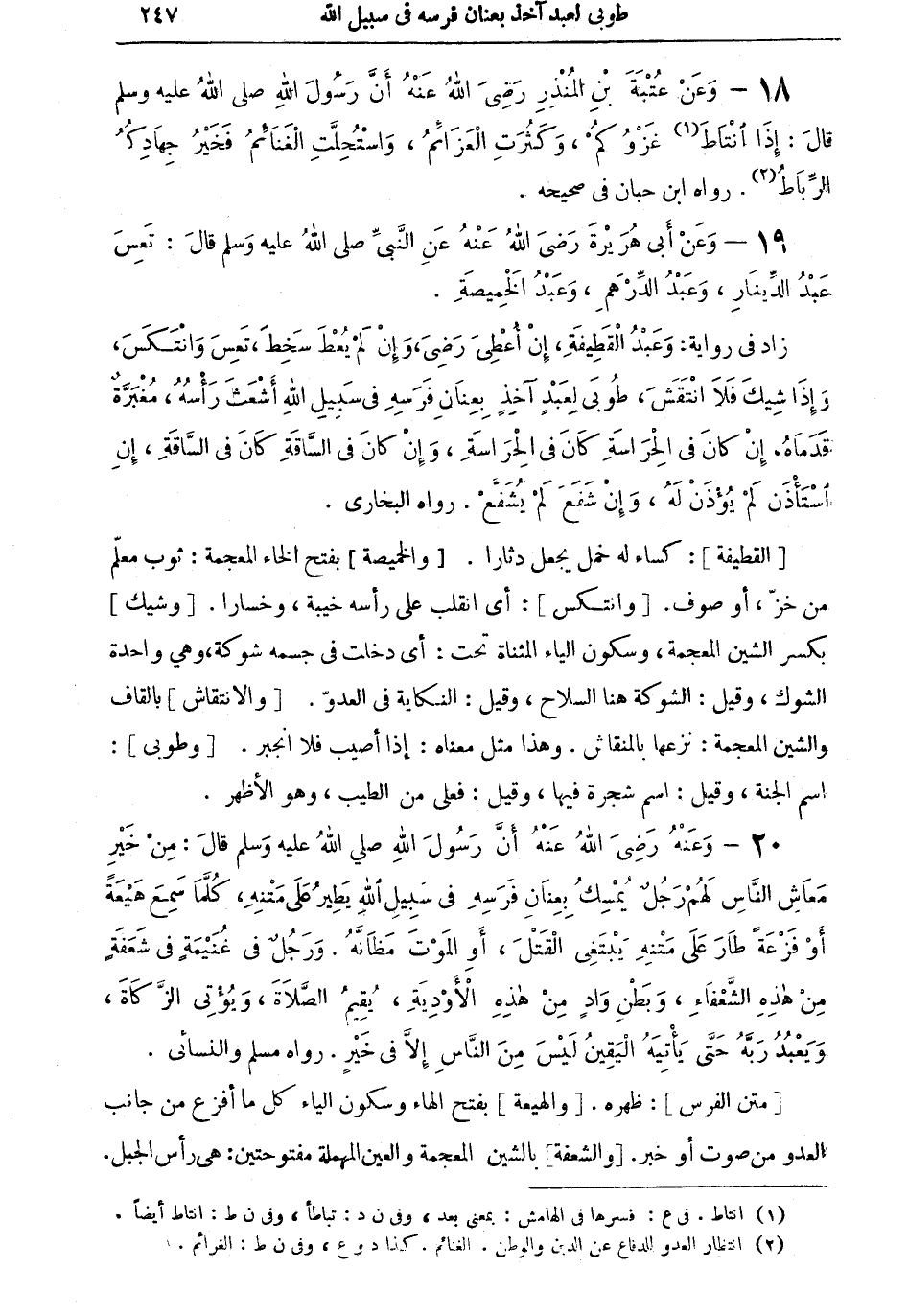 زاد في رواية: وعبد القطيفة إنْ أعطى رضي، وإنْ لمْ يعط سخط، تعس وانتكس، وإذا شيك فلا انتقش، طوبى لعبدٍ آخذٍ بعنان فرسهِ في سبيل الله أشعث رأسه مغبرَّة قدماه إن كان في الحراسة كان في الحراسةِ، وإنْ كان السَّاقة كان في السَّاقة، إن استأذن لمْ يؤذن له، وإن شفع لمْ يشفَّع. رواه البخاري.