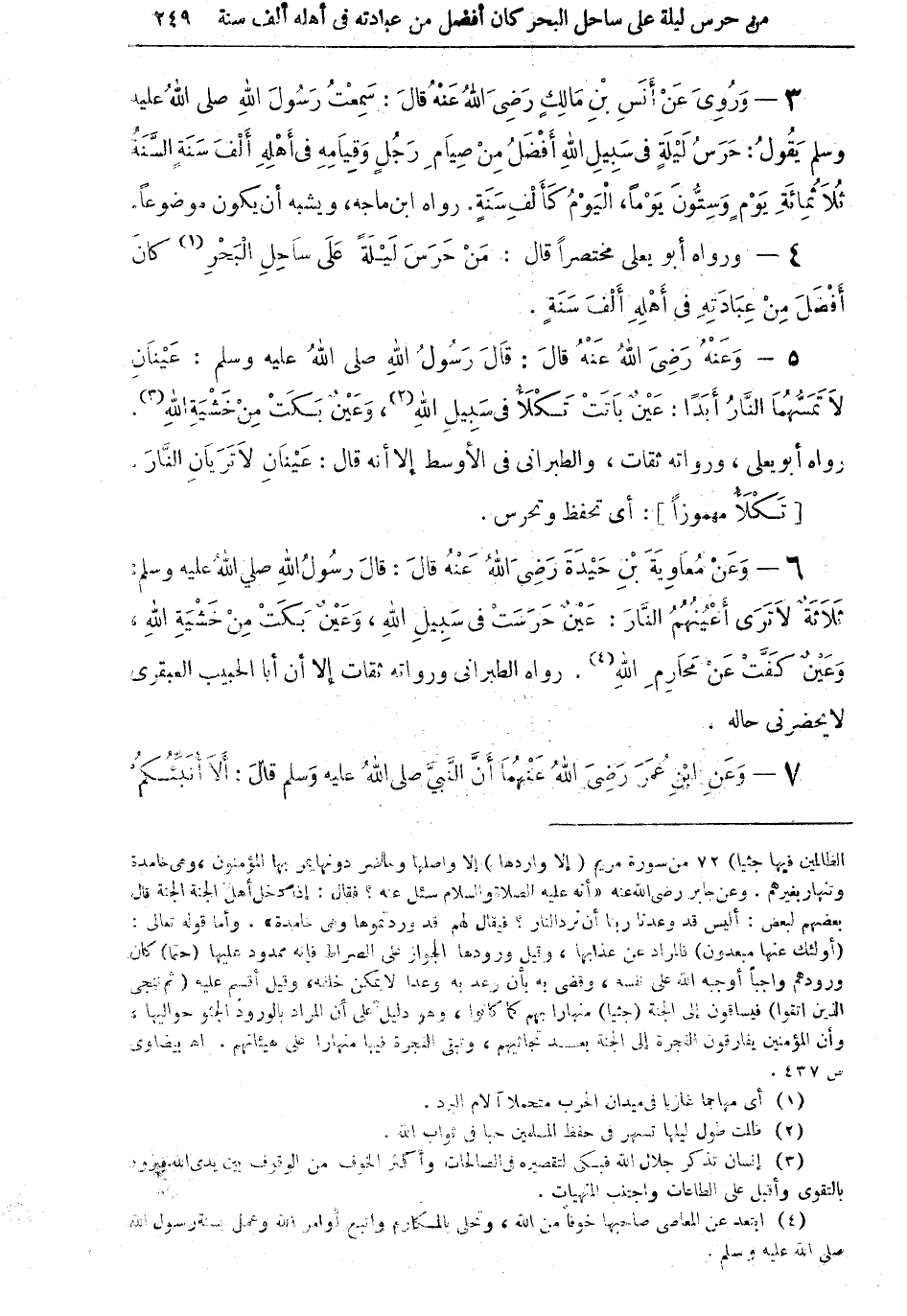 6 - وعنْ معاوية بن حيدة رضي الله عنه قال: قال رسول الله صلى الله عليه وسلم: ثلاثة لا ترى أعينهمُ النَّار: عينْ حرست في سبيل الله، وعين بكتْ من خشية الله، وعينٌ كفَّتْ عن محارم الله (¬4). رواه الطبراني ورواته ثقات إلا أن أبا الحبيب العبقري لا يحضرني حاله.