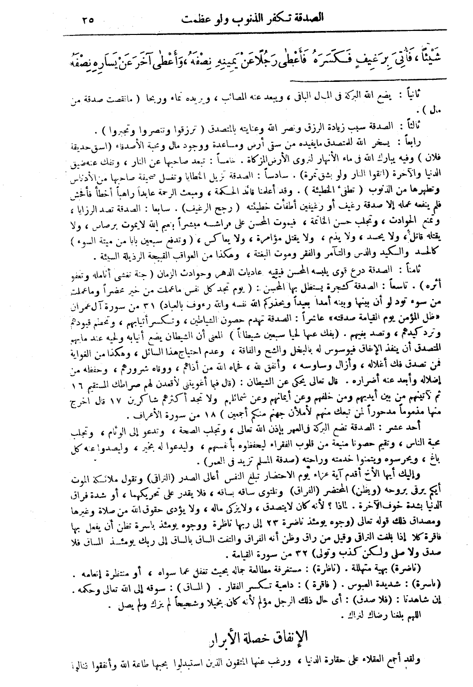 سادساً: الصدقة تزيل الخطايا وتغسل صحيفة صاحبها من الأدناس وتطهرها من الذنوب (تطفئ الخطيئة). وقد أعلمنا قائد الحكمة، ومبعث الرحمة عابداً راهباً أخطأ فأفحش فلم ينفعه عمله إلا صدقة رغيف أورغيفين أطفأت خطيئته (رجح الرغيف).