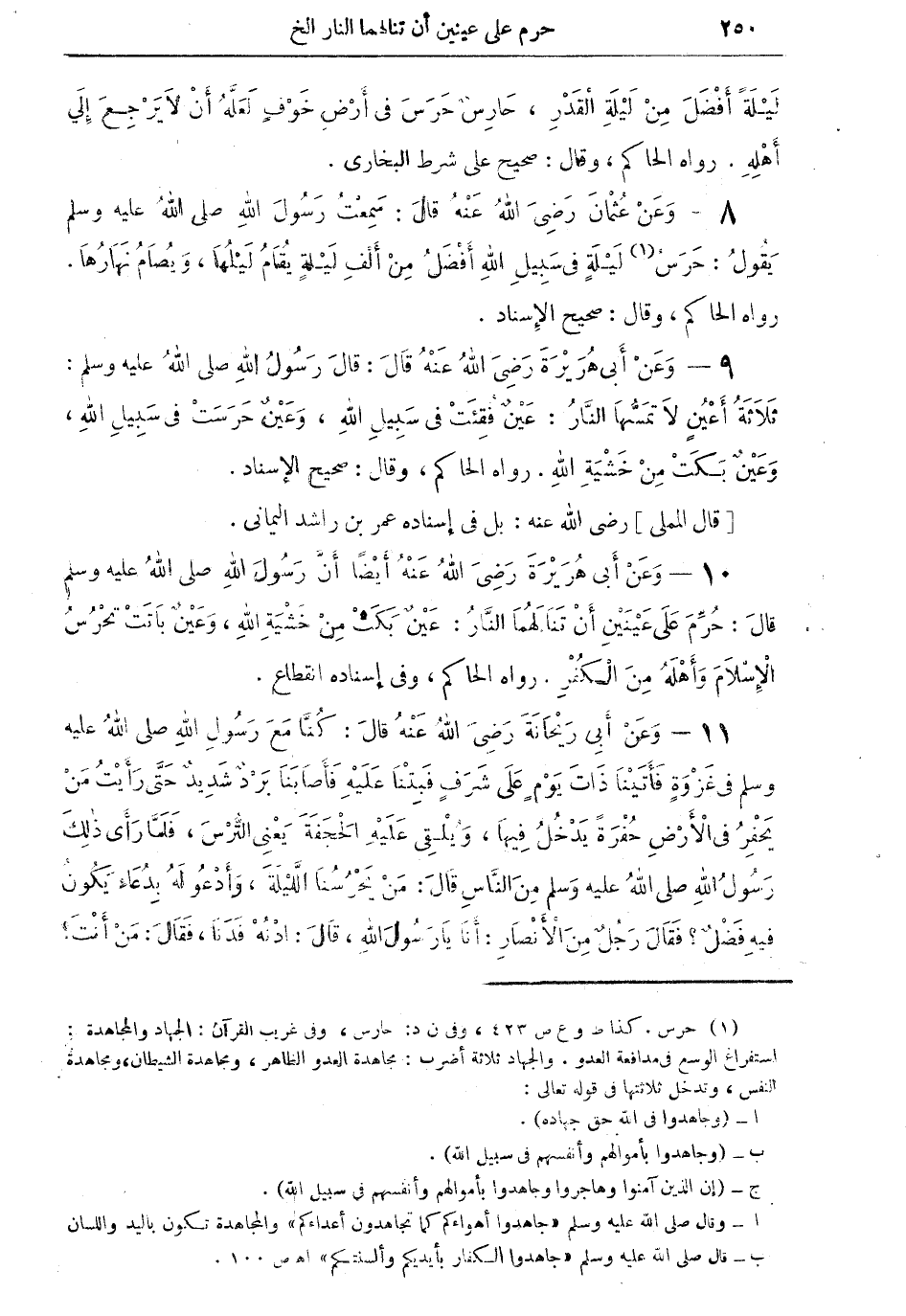 8 - وعنْ عثمان رضي الله عنه قال: سمعتُ رسول الله صلى الله عليه وسلم يقول: حرس (¬1) ليلةٍ في سبيل الله أفضل من ألف ليلةٍ يقام ليلها، ويصام نهارها. رواه الحاكم، وقال: صحيح الإسناد.
