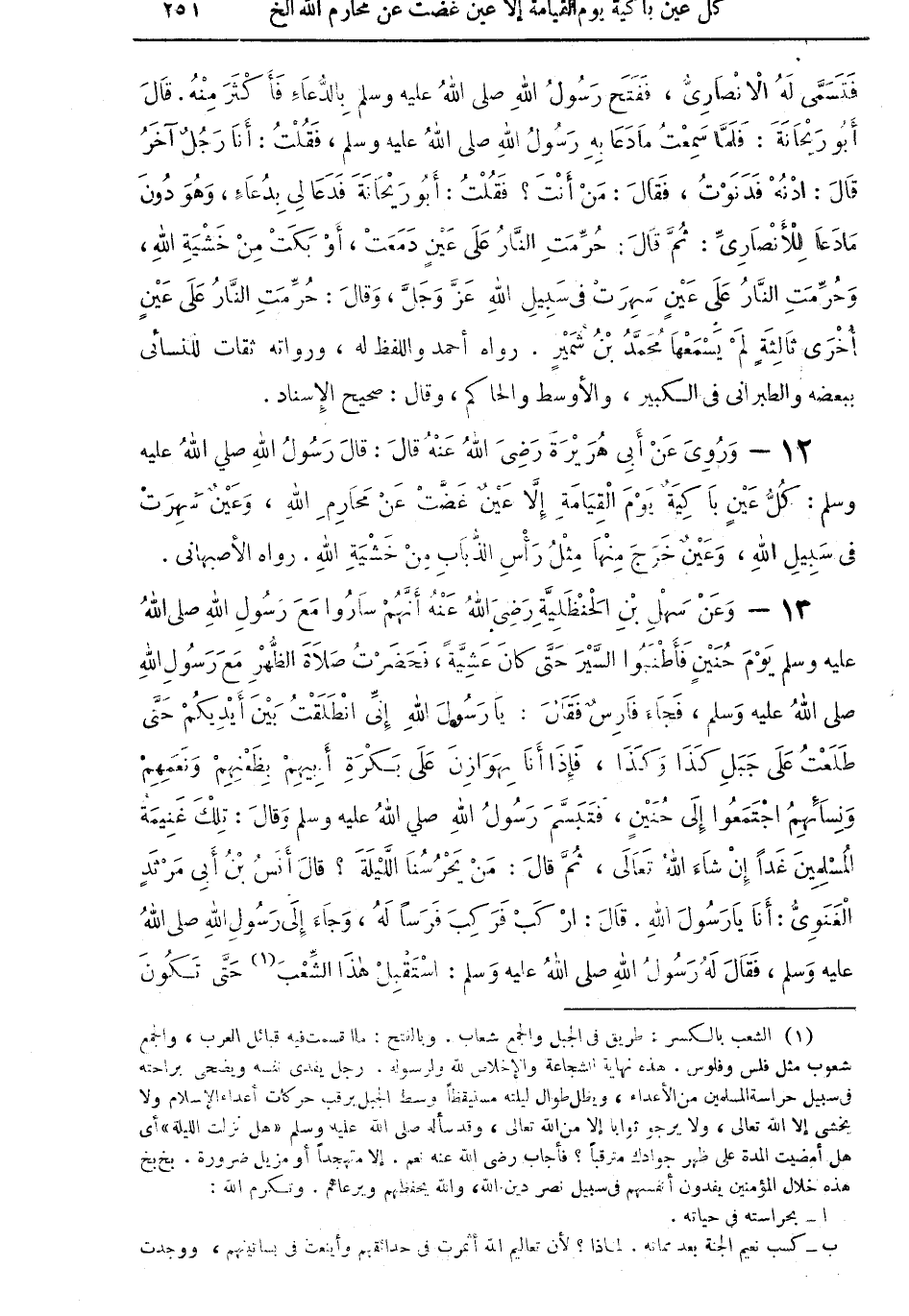 (¬1) الشعب بالكسر: طريق في الجبل والجمع شعاب. وبالفتح. ما انقسمت فيه قبائل العرب، والجمع شعوب مثل فلس وفلوس. هذه نهاية الشجاعة والإخلاص لله ولرسوله. رجل يفدي نفسه ويضحي براحته في سبيل حراسة المسلمين من الأعداء، ويظل طوال ليلته مستيقظاً وسط الجبل يرقب حركات اعداء الإسلام، ولا يخشى إلا الله تعالى، ولا يرجو ثوابا إلا من الله تعالى، وقد سأله صلى الله عليه وسلم: (هل نزلت الليلة) أي هل أمضيت المدة على ظهر جوادك مترقباً؟ فأجاب رضي الله عنه نعم. إلا متهجدا أو مزيل ضرورة. بخ بخ هذه خلال المؤمنين يفدون أنفسهم في سبيل نصر دين الله، والله يحفظهم ويرعاهم. وتكرم الله: