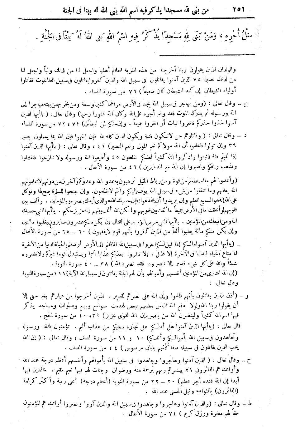 ز - قال تعالى: يا أيها الذين آمنوا هل أدلكم على تجارة تنجيكم من عذاب أليم. تؤمنون بالله ورسوله وتجاهدون في سبيل الله بأموالكم وأنفسكم) 10، 11 من سورة الصف، وقال تعالى: (إن الله يحب الذين يقاتلون في سبيله صفا كأنهم بنيان مرصوص) 4، من سورة الصف.