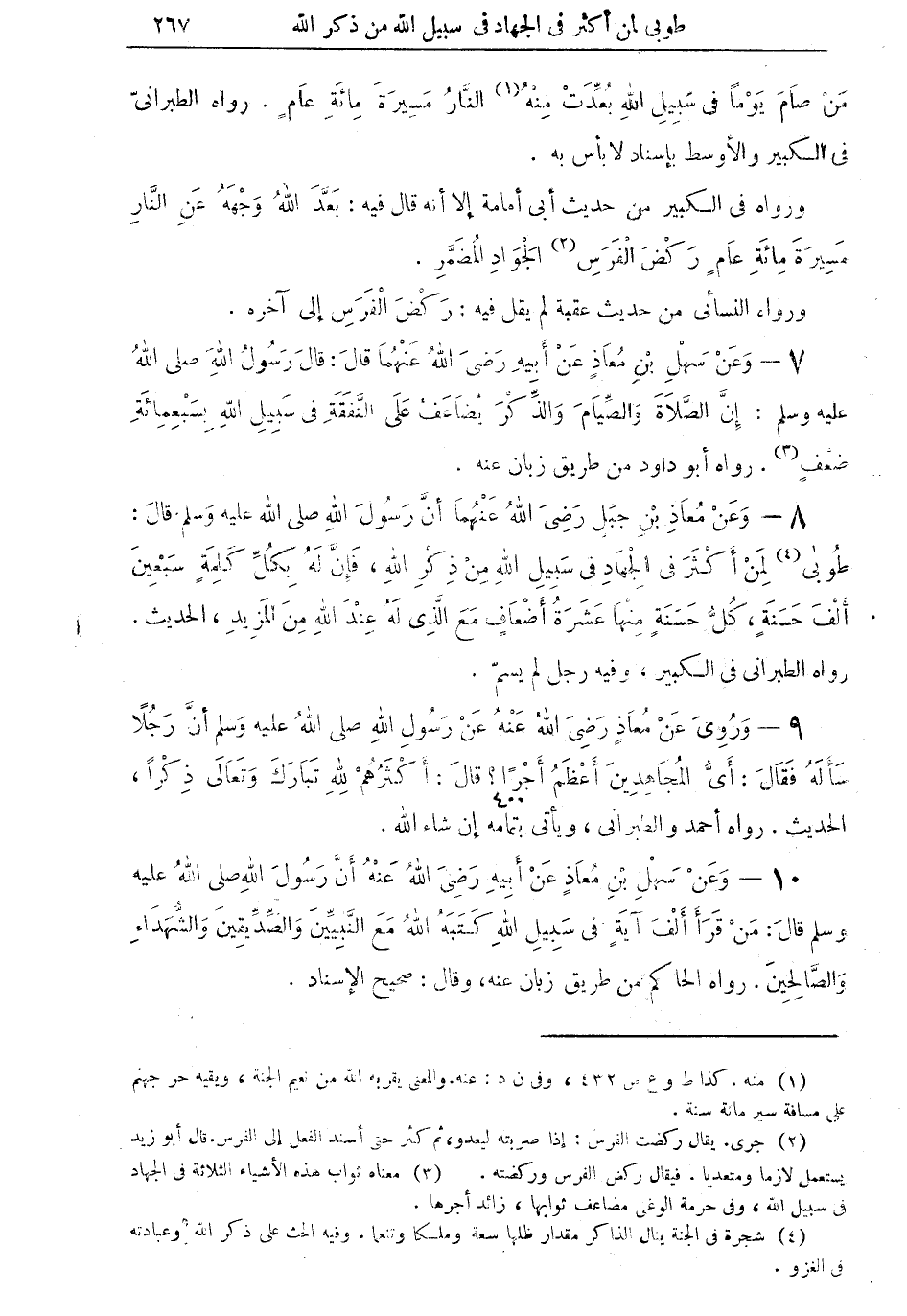 8 - وعنْ معاذ بن جبلٍ رضي الله عنهما أنَّ رسول الله صلى الله عليه وسلم قال: طوبى (¬4) لمنْ أكثر في الجهاد في سبيل الله من ذكر الله، فإنَّ له بكلِّ كلمةٍ سبعين ألف حسنةٍ، كلُّ حسنةٍ منها عشرة أضعاف مع الذي له عند الله من المزيد، الحديث. رواه الطبراني في الكبير، وفيه رجل لم يسمّ.