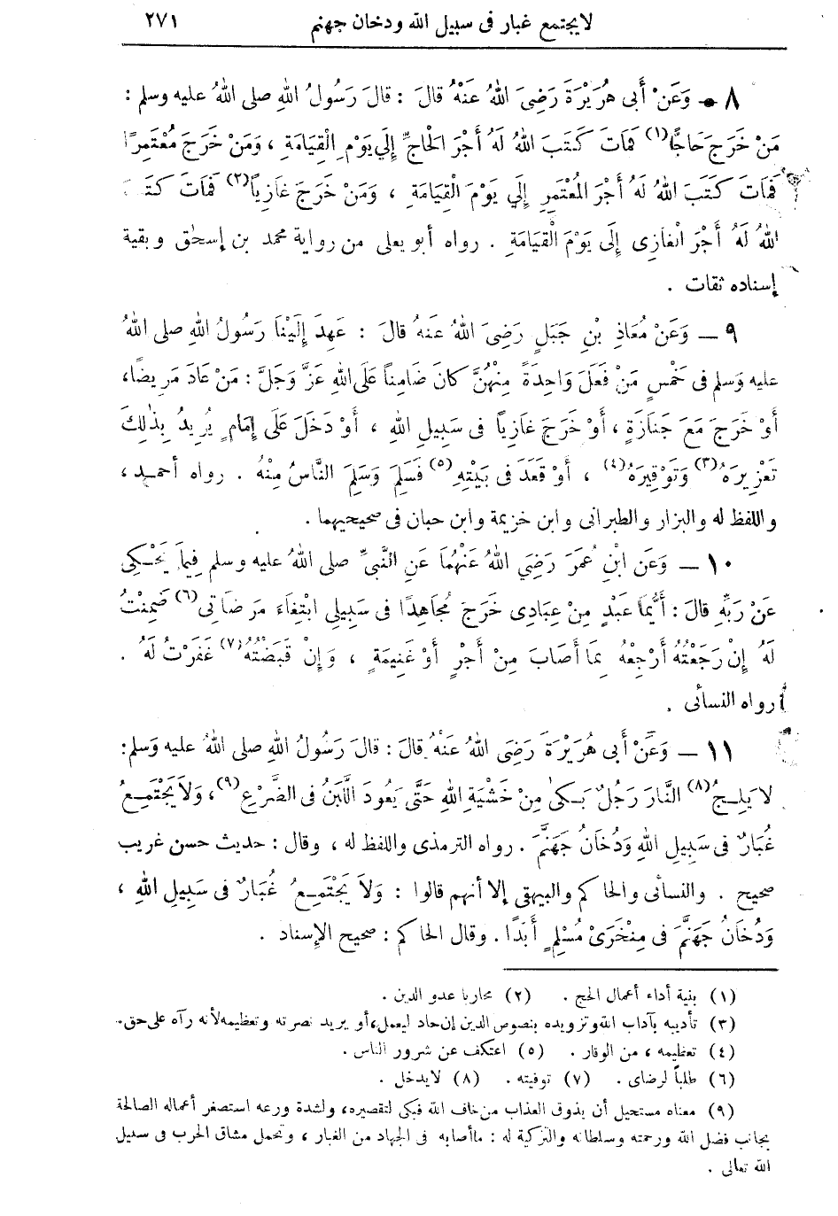 10 - وعن ابن عمر رضي الله عنهما عن النَّبيِّ صلى الله عليه وسلم فيما يحكي عن ربِّه قال: أيُّما عبدٍ من عبادي خرج مجاهداً في سبيلي ابتغاء مرضاتي (¬6) ضمنت له إنْ رجعتهُ أرْجعهُ بما أصاب من أجرٍ أو غنيمةٍ، وإنْ قبضتهُ (¬7) غفرتُ له. رواه النسائي.