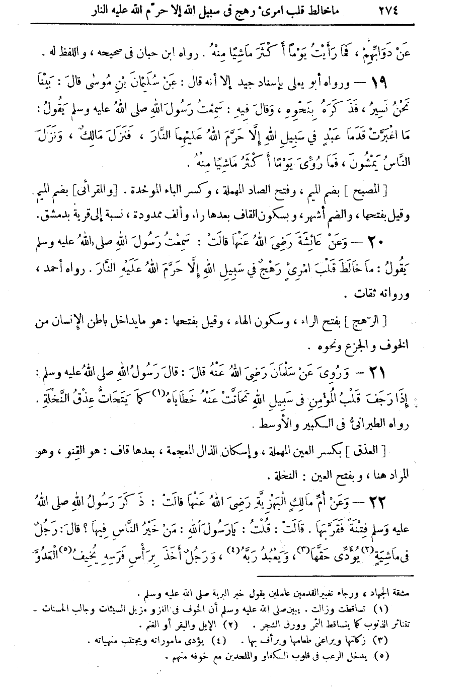 20 - وعنْ عائشة رضي الله عنها قالتْ: سمعت رسول الله صلى الله عليه وسلم يقول: ما خالط قلْب امرئٍ رهجٌ في سبيل الله إلا حرَّم الله عليه النار. رواه أحمد، ورواته ثقات.