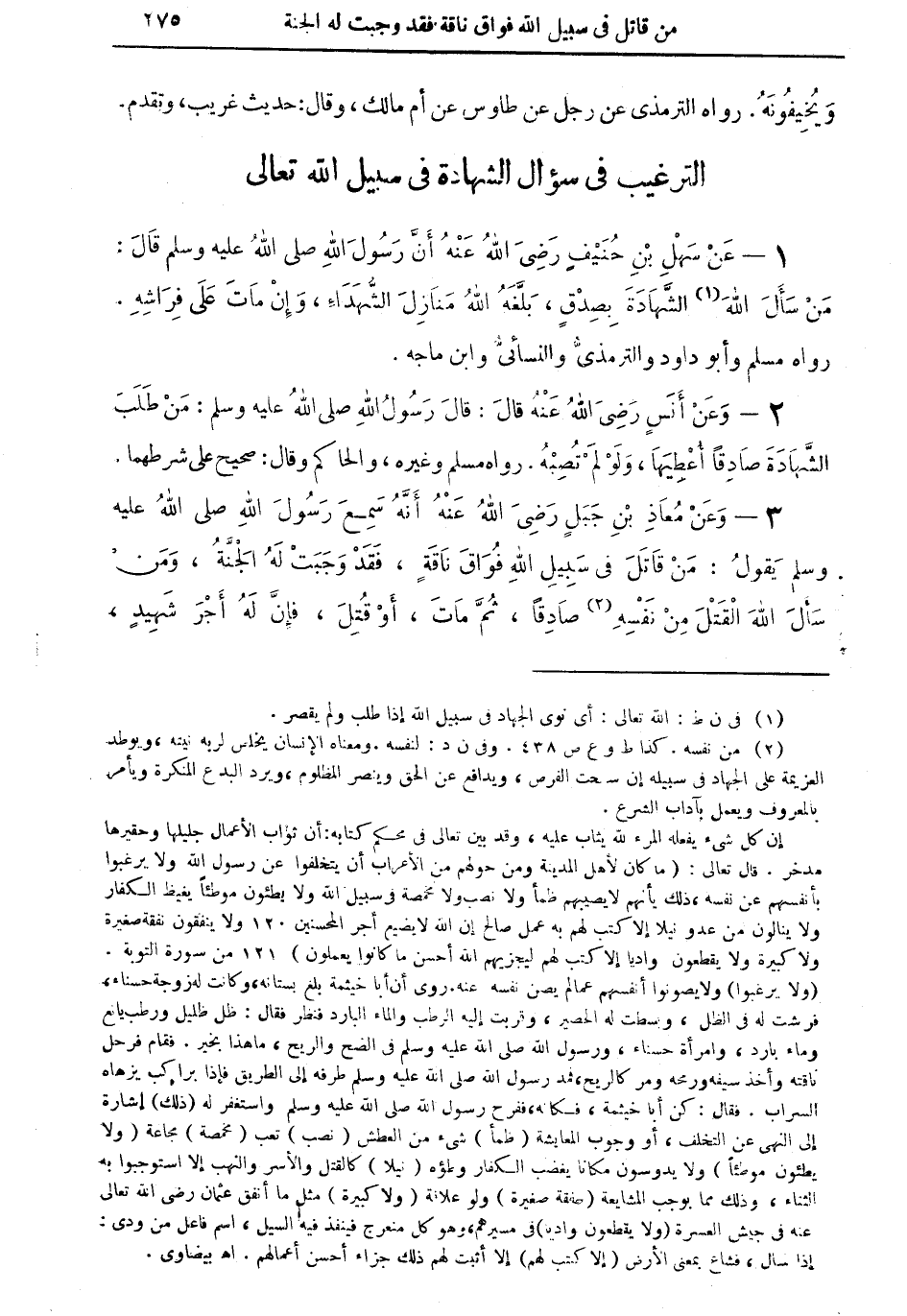 1 - عنْ سهل بن حنيفٍ رضي الله عنه: أنَّ رسول الله صلى الله عليه وسلم قال: من سأل الله (¬1) الشهادة بصدقٍ، بلَّغة الله منازل الشُّهداء، وإنْ مات على فراشهِ. رواه مسلم وأبو داود والترمذيُّ والنسائي وابن ماجه.