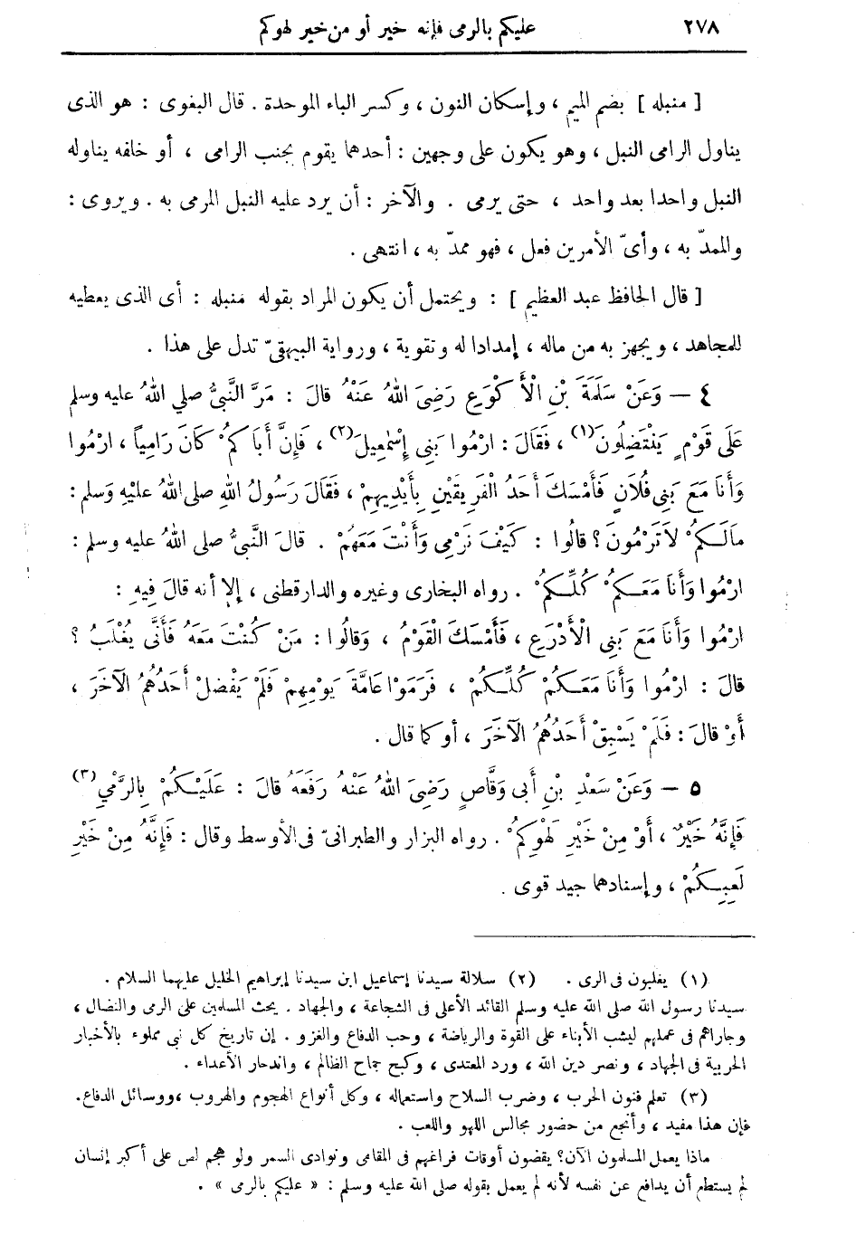 5 - وعنْ سعد بن أبي وقَّاص رضي الله عنه رفعه قال: عليكمْ بالرَّمي (¬3) فإنَّه خيرٌ، أوْ من خير لهولكمْ. رواه البزار والطبراني في الأوسط وقال: فإنَّه من خير لعبكمْ، وإسنادهما جيد قوي.