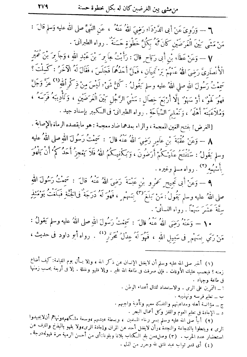 6 - وروي عن أبي الدَّرداء رضي الله عنه، عن النبيِّ صلى الله عليه وسلم قال: من مشى بين الغرضين كان له بكلِّ خطوة حسنة. رواه الطبراني.