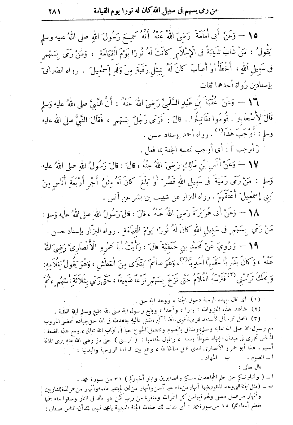 18 - وعنْ أبي هريرة رضي الله عنه، قال: قال رسول الله صلى الله عليه وسلم: من رمى بسهمٍ في سبيل الله كان له نوراً يوم القيامة. رواه البزار بإسناد حسن.