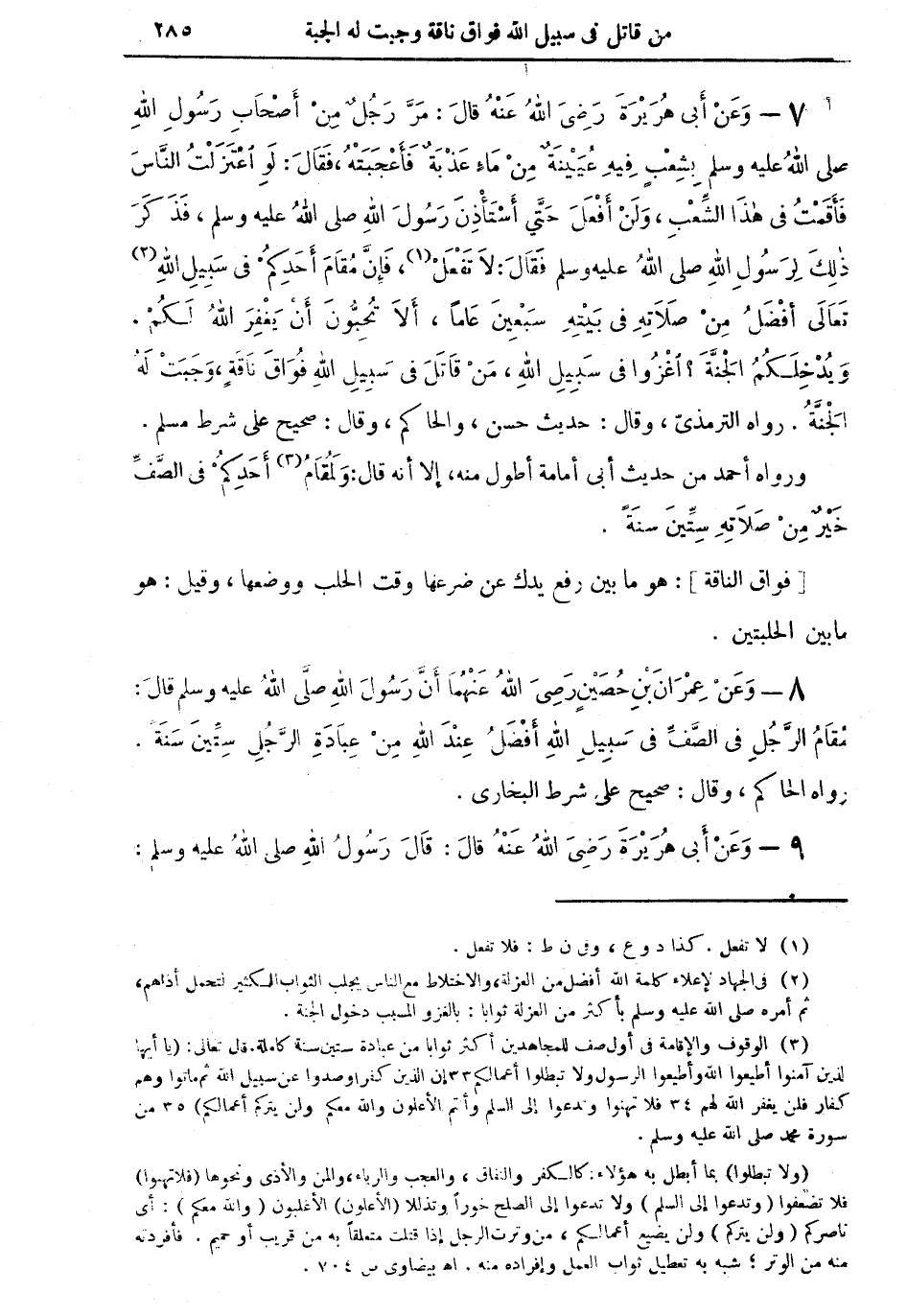 7 - وعنْ أبي هريرة رضي الله عنه قال: مرَّ رجل من أصحاب رسول الله صلى الله عليه وسلم بشعبٍ فيه عينة من دماء عذبة فأجبته، فقال: لو اعتزلت الناس فأقمت في هذا الشِّعْبِ، ولنْ أفعل حتى أستأذن رسول الله صلى الله عليه وسلم، فذكر ذلك لرسول الله صلى الله عليه وسلم فقال: لا تفعل (¬1) فإنَّ مقام أحدكمْ في سبيل الله (¬2) تعالى أفضل من صلاته في بيته سبعين عاماً، ألا تحبُّون أن يغفر الله لكمْ، ويدخلكم الجنَّة؟ اغزوا في سبيل الله، منْ قاتل في سبيل الله فواق ناقةٍ، وجبتْ له الجنَّة. رواه الترمذي، وقال: حديث حسن، والحاكم، وقال: صحيح على شرط مسلم.