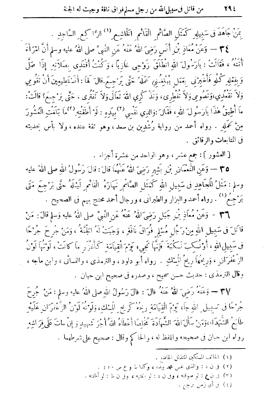 36 - وعنْ معاذ بن جبلٍ رضي الله عنه عن النبي صلى الله عليه وسلم قال: منْ قاتل في سبيل الله من رجلٍ مسلمٍ فواق ناقةٍ، وجبتْ له الجنَّة، ومنْ جرح جرحاً في سبيل الله، أوْ نكب نكبةً فإنَّها تجيء يوم القيامة كأغزر ما كانتْ، لونها لون الزَّعفران، وريحها ريح المسك. رواه أبو داود والترمذي، والنسائي وابن ماجه، وقال: الترمذي: حديث حسن صحيح، وصدره في صحيح ابن حبان.