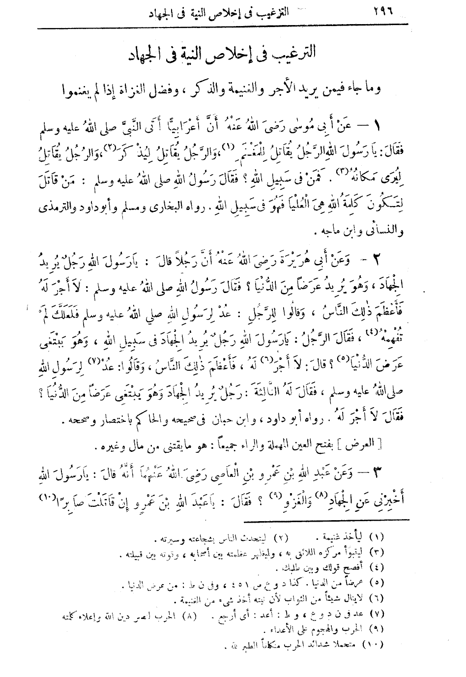 1 - عنْ أبي موسى رضي الله عنه أنَّ أعرابيا أتى النبيَّ صلى الله عليه وسلم فقال: يا رسول الله الرَّجل يقاتل للمغنم (¬1)، والرَّجل يقاتل ليذكر (¬2)، والرَّجل يقاتل ليرى مكانه (¬3) فمنْ في سبيل الله؟ فقال رسول الله صلى الله عليه وسلم: منْ قاتل لتكون كلمة الله هي العليا فهو في سبيل الله. رواه البخاري ومسلم وأبو داود والترمذي والنسائي وابن ماجه.