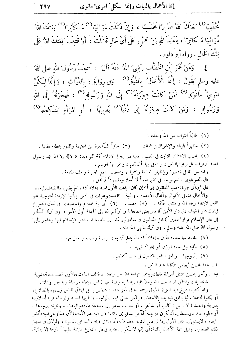 وقد كتب الشيخ عبد العزيز الخولي رحمه الله في معنى هذا: شخص يصل ليرائى الناس فيسموه بالصلاح، أو يكلوا له عملا ماليا يطلق فيه يده بالاختلاس، وآخر يصل قياما بالواجب، وتطهيرا لنفسه، وإرضاء لربه أصلاتهما بدرجة واحدة؟ لا: بل كاتب أو شاعر، أو خطيب يدعو إلى مصلحة عامة والباعث له وظيفة يرجوها، أو حظوة عند ذي سطان. أتكون درجته كآخر يدعو إلى ذلك؟ لأن فيه خير الأمة، ولأن هذا وحي قلبه المخلص لبلده، لا يستويان. فإن الأول إذا لم يصل لبغيته حطم قلمه، أما الثاني فإنه دائب على الدعوة، ولولا في سبيل ذلك الصعاب، وقيل صحة الأعمال بالنية: أي إنها لا تكون معتبرة في نظر الشارع مترتبة عليها آثارها إلا بالنية، =