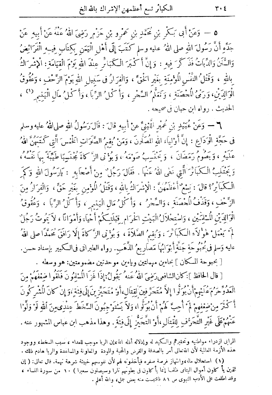 5 - وعن أبي بكر بن محمَّد بن عمرو بن حزمٍ رضي الله عنه عنْ أبيه عن جده أنَّ رسول الله صلى الله عليه وسلم كتب إلى أهل اليمن بكتابٍ فيه الفرائض والسُّنن والدِّيات فذكر فيه: وإنَّ أكبر الكبائر عند الله يوم القيامة: الإشراك بالله، وقتل النفس المؤمنة بغير الحقِّ، والفرار في سبيل الله يوم الزحف، وعقوق الوالدين، ورمي المحصنة، وتعلم السحر، وأكل الرِّبا، وأكل مال اليتيم (¬1)، الحديث. رواه ابن حبان في صحيحه.