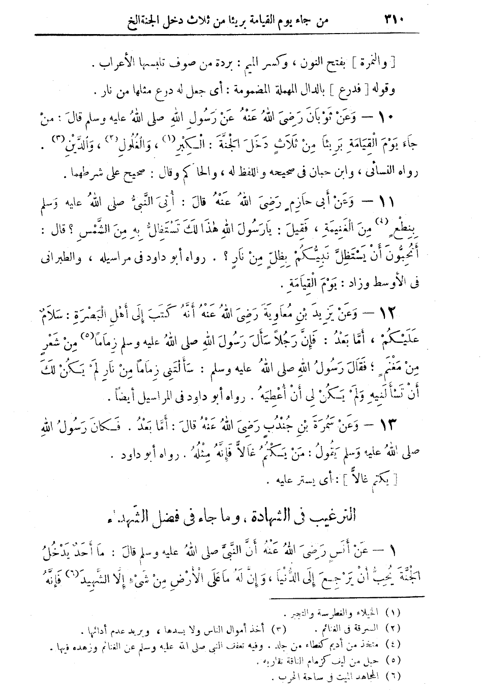 10 - وعنْ ثوبان رضي الله عنه عن رسول الله صلى الله عليه وسلم قال: من جاء يوم القيامة بريئاً من ثلاثٍ دخل الجنَّة: الكبر (¬1)، والغلول (¬2)، والدين (¬3). رواه النسائي، وابن حبان في صحيحه واللفظ له، والحاكم وقال: صحيح على شرطهما.