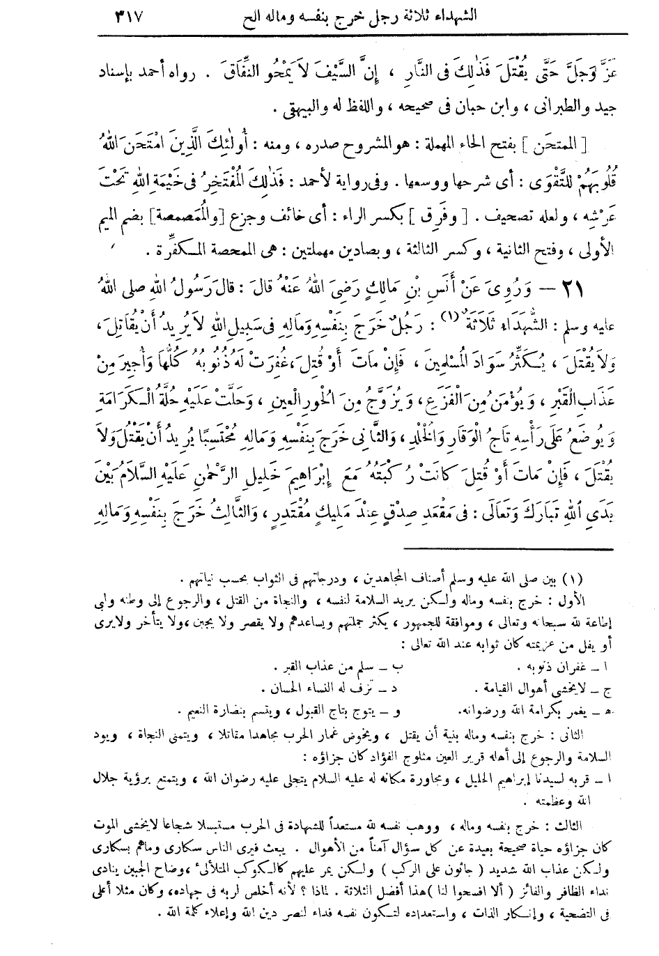 21 - وَرُوِيَ عَن أنس بن مَالك رَضِي الله عَنهُ قَالَ قَالَ رَسُول الله صلى الله عَلَيْهِ وَسلم الشُّهَدَاء ثَلَاثَة (¬1) رجل خرج بِنَفسِهِ وَمَاله فِي سَبِيل الله لَا يُرِيد أَن يُقَاتل وَلَا يقتل يكثر سَواد الْمُسلمين فَإِن مَاتَ أَو قتل غفرت لَهُ ذنُوبه كلهَا وأجير من عَذَاب الْقَبْر ويؤمن من الْفَزع ويزوج من الْحور الْعين وحلت عَلَيْهِ حلَّة الْكَرَامَة وَيُوضَع على رَأسه تَاج الْوَقار والخلد وَالثَّانِي خرج بِنَفسِهِ وَمَاله محتسبا يُرِيد أَن يقتل وَلَا يقتل فَإِن مَاتَ أَو قتل كَانَت ركبته مَعَ إِبْرَاهِيم خَلِيل الرَّحْمَن عَلَيْهِ السَّلَام بَين يَدي الله تبَارك وَتَعَالَى {فِي مقْعد صدق عِنْد مليك مقتدر} وَالثَّالِث خرج بِنَفسِهِ وَمَاله