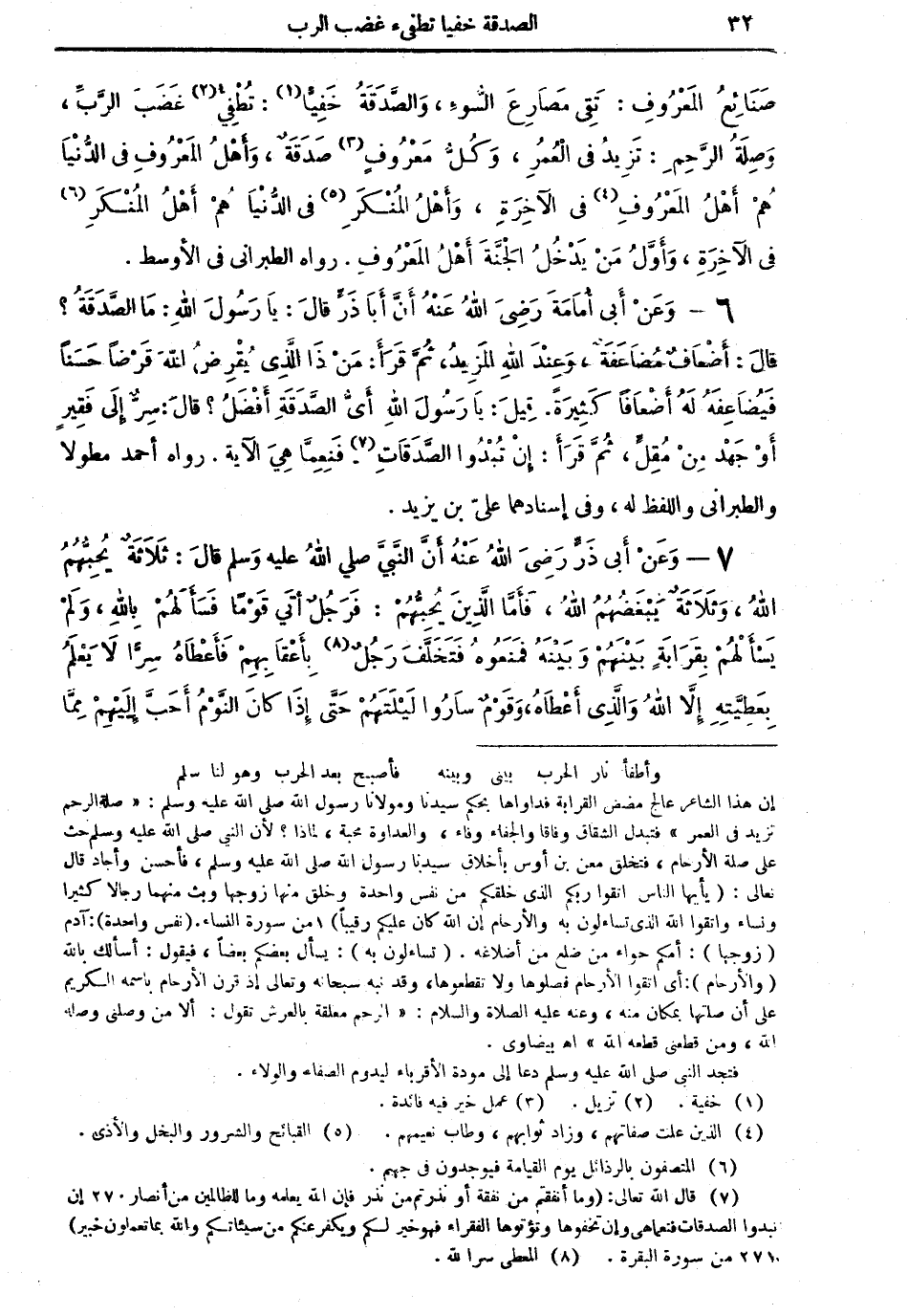 7 - وعنْ أبي ذرٍّ رضي الله عنهُ أنَّ النَّبيَّ صلى الله عليه وسلم قال: ثلاثة يحبُّهمُ الله، وثلاثة يبْغضُهُمُ الله، فأمَّا الذين يحبُّهمْ: فرجل أتي قوماً فسألهمْ بالله، ولمْ يسْألهُمْ بقرابةٍ بينهمْ وبينه فمنعوه فتخلَّف رجلٌ (¬8) بأعقابهم فأعطاه سرًّا لا يعْلمُ بعطيتهِ إلا الله والذي أعْطاه، وقوم ساروا ليْلتهمْ حتى إذا كان النَّومُ أحب إليهم مما
