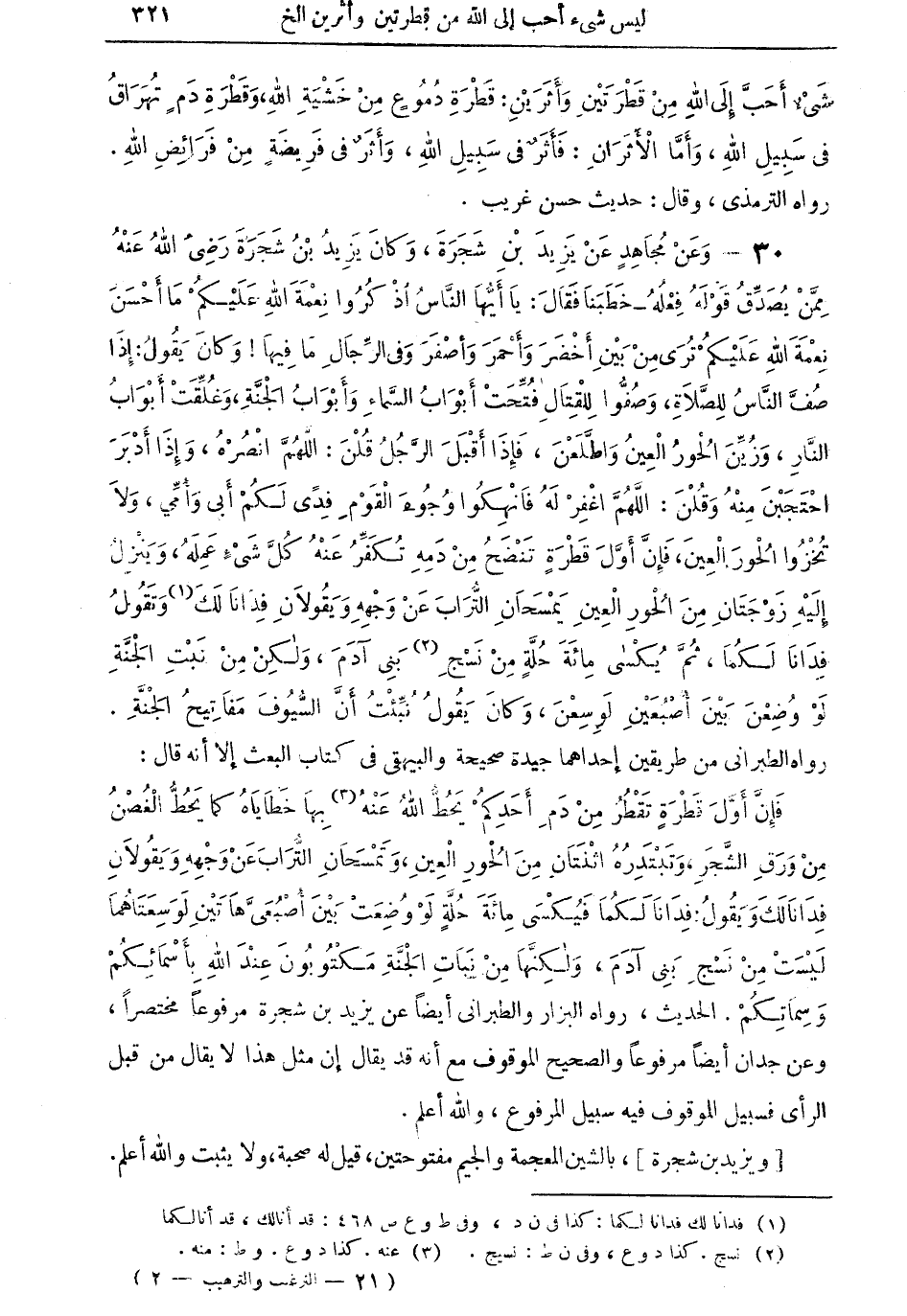 رَوَاهُ الطَّبَرَانِيّ من طَرِيقين إِحْدَاهمَا جَيِّدَة صَحِيحَة وَالْبَيْهَقِيّ فِي كتاب الْبَعْث إِلَّا أَنه قَالَ فَإِن أول قَطْرَة تقطر من دم أحدكُم يحط الله عَنهُ (¬3) بهَا خطاياه كَمَا يحط الْغُصْن من ورق الشّجر وتبتدره اثْنَتَانِ من الْحور الْعين وتمسحان التُّرَاب عَن وَجهه ويقولان فدانا لَك وَيَقُول فدانا لَكمَا فيكسى مائَة حلَّة لَو وضعت بَين أُصْبُعِي هَاتين لوسعتاهما لَيست من نسج بني آدم وَلكنهَا من نَبَات الْجنَّة مكتوبون عِنْد الله بأسمائكم وسماتكم