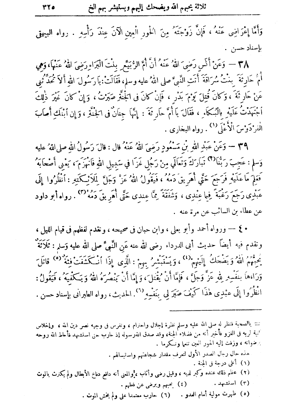 38 - وَعَن أنس رَضِي الله عَنهُ أَن أم الرّبيع بنت الْبَراء رَضِي الله عَنْهَا وَهِي أم حَارِثَة بنت سراقَة أَتَت النَّبِي صلى الله عَلَيْهِ وَسلم فَقَالَت يَا رَسُول الله صلى الله عَلَيْهِ وَسلم أَلا تُحَدِّثنِي عَن حَارِثَة وَكَانَ قتل يَوْم بدر فَإِن كَانَ فِي الْجنَّة صبرت وَإِن كَانَ غير ذَلِك اجتهدت عَلَيْهِ بالبكاء فَقَالَ يَا أم حَارِثَة إِنَّهَا جنان فِي الْجنَّة وَإِن ابْنك أصَاب الفردوس الْأَعْلَى (¬1)