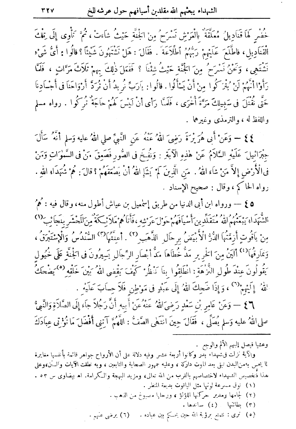 44 - وعن أبي هريرة رضي الله عنه عن النبي صلى الله عليه وسلم أَنه سَأَلَ جِبْرَائِيل عَلَيْهِ السَّلَام عَن هَذِه الْآيَة {وَنفخ فِي الصُّور فَصعِقَ من فِي السَّمَوَات وَمن فِي الأَرْض إِلَّا من شَاءَ الله} من الَّذين لم يشإ الله أَن يصعقهم قَالَ هم شُهَدَاء الله