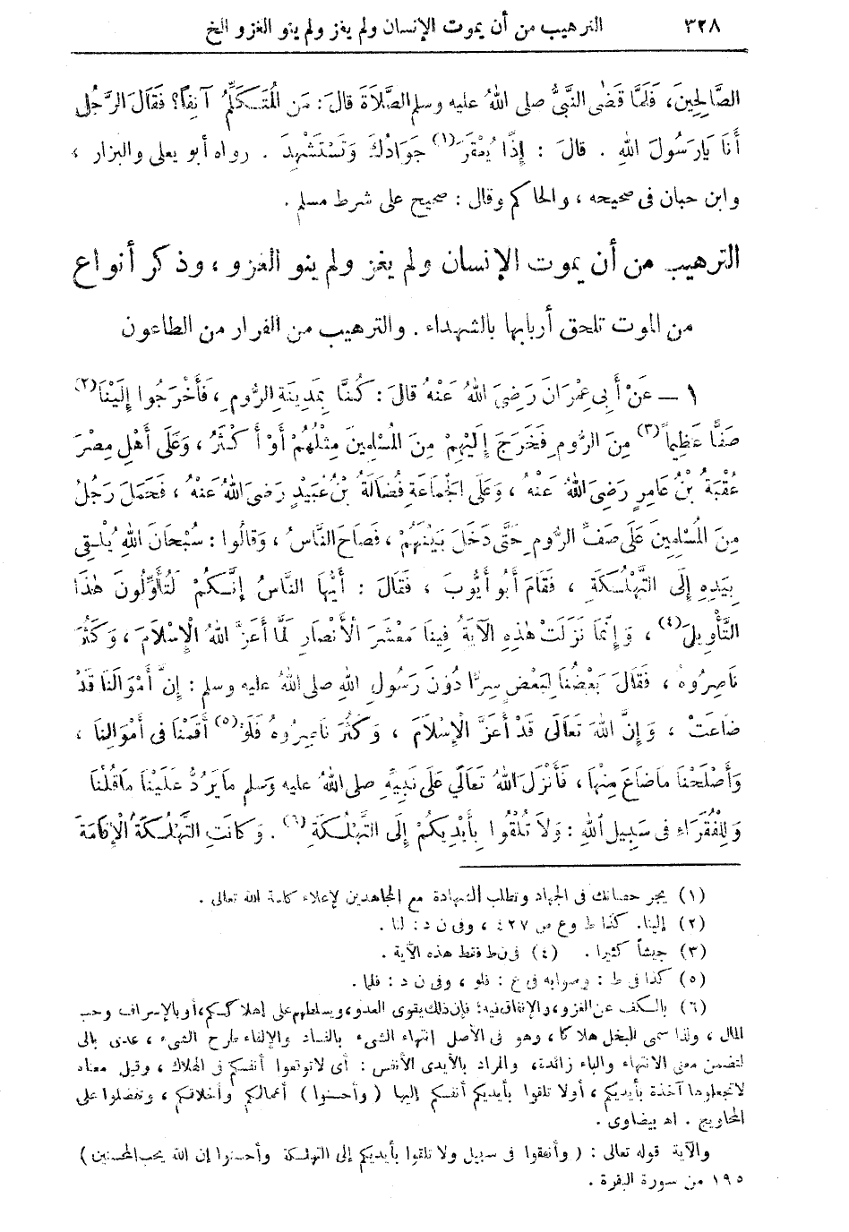 1 - عَن أبي عمرَان رَضِي الله عَنهُ قَالَ كُنَّا بِمَدِينَة الرّوم فأخرجوا إِلَيْنَا (¬2) صفا عَظِيما (¬3) من الرّوم فَخرج إِلَيْهِم من الْمُسلمين مثلهم أَو أَكثر وعَلى أهل مصر عقبَة بن عَامر رَضِي الله عَنهُ وعَلى الْجَمَاعَة فضَالة بن عبيد رَضِي الله عَنهُ فَحمل رجل من الْمُسلمين على صف الرّوم حَتَّى دخل بَينهم فصاح النَّاس وَقَالُوا سُبْحَانَ الله يلقِي بِيَدِهِ إِلَى التَّهْلُكَة فَقَامَ أَبُو أَيُّوب فَقَالَ أَيهَا النَّاس إِنَّكُم لَتَأَوَّلُون هَذَا التَّأْوِيل (¬4) وَإِنَّمَا نزلت هَذِه الْآيَة فينا معشر الأنصار، لما أعز الله الإسلام، وكثر ناصروه، فقال بعضنا لبعضٍ سراً دون رَسُول الله صلى الله عَلَيْهِ وَسلم إِن أَمْوَالنَا قد ضَاعَت وَإِن الله تَعَالَى قد أعز الْإِسْلَام وَكثر ناصروه فَلَو (¬5) أَقَمْنَا فِي أَمْوَالنَا وأصلحنا مَا ضَاعَ مِنْهَا فَأنْزل الله تَعَالَى على نبيه صلى الله عَلَيْهِ وَسلم مَا يرد علينا مَا قُلْنَا وللفقراء فِي سَبِيل الله {وَلَا تلقوا بِأَيْدِيكُمْ إِلَى التَّهْلُكَة} (¬6) وَكَانَت التَّهْلُكَة الْإِقَامَة