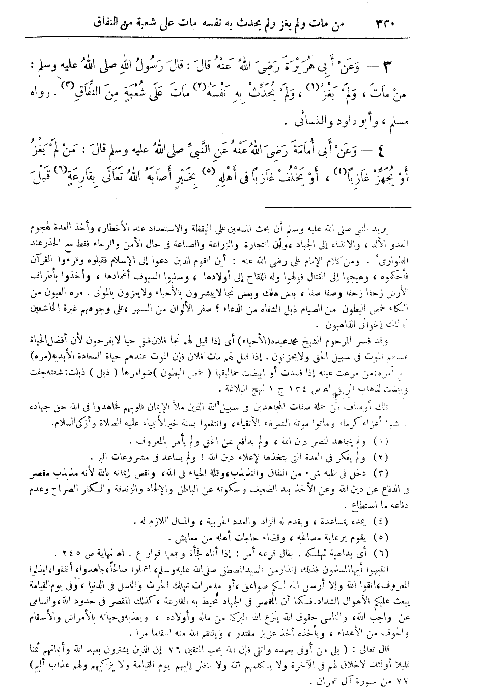 3 - وَعَن أبي هُرَيْرَة رَضِي الله عَنهُ قَالَ قَالَ رَسُول الله صلى الله عَلَيْهِ وَسلم من مَاتَ وَلم يغز (¬1) وَلم يحدث بِهِ نَفسه (¬2) مَاتَ على شُعْبَة من النِّفَاق (¬3)