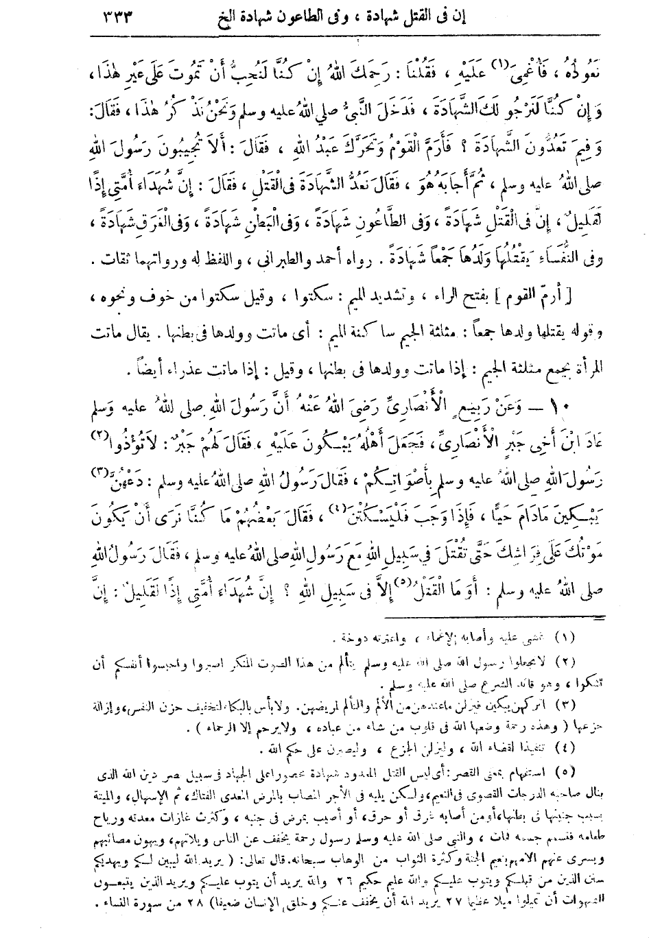 (¬5) استفهم بمعنى القصر: أي ليس القتل المعدود شهادة محصورا على الجهاد في سبيل نصر دين الله الذي ينال تصاحبه الدرجات القصوى في النعيم، ولكن يليه في الأجر المصاب بالمرض المعدي الفتاك، ثم الإسهال، والميتة بسبب جنيها في بطنها، أو من أصابه غرق أو حرق، أو أصيب بمرض في جنبه، وكثرث غازات معدته ورياح طعامه فتسمم جسمه فمات، والنبي صلى الله عليه وسلم رسول رحمة يحفف عن الناس ويلاتهم، ويهون مصائبهم ويسري عن آلامهم بنعيم الجنة وكثرة الثواب من الوهاب سبحانه. قال: تعالى (يريد الله ليبين لكم ويهديكم سنن الذين من قبلكم ويتوب عليكم والله عليم حكيم 26 والله يريد أن يتوب عليكم ويريد الذين يتبعون الشهوات أن تميلوا ميلا عظيما 27 يريد الله أن يحفف عنكم وخلق الإنسان ضعيفا) 28 من سورة النساء. =