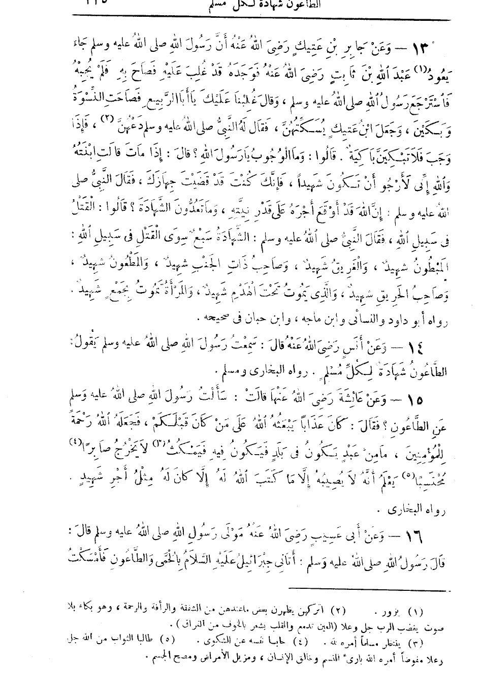 14 - وَعَن أنس رَضِي الله عَنهُ قَالَ سَمِعت رَسُول الله صلى الله عَلَيْهِ وَسلم يَقُول الطَّاعُون شَهَادَة لكل مُسلم