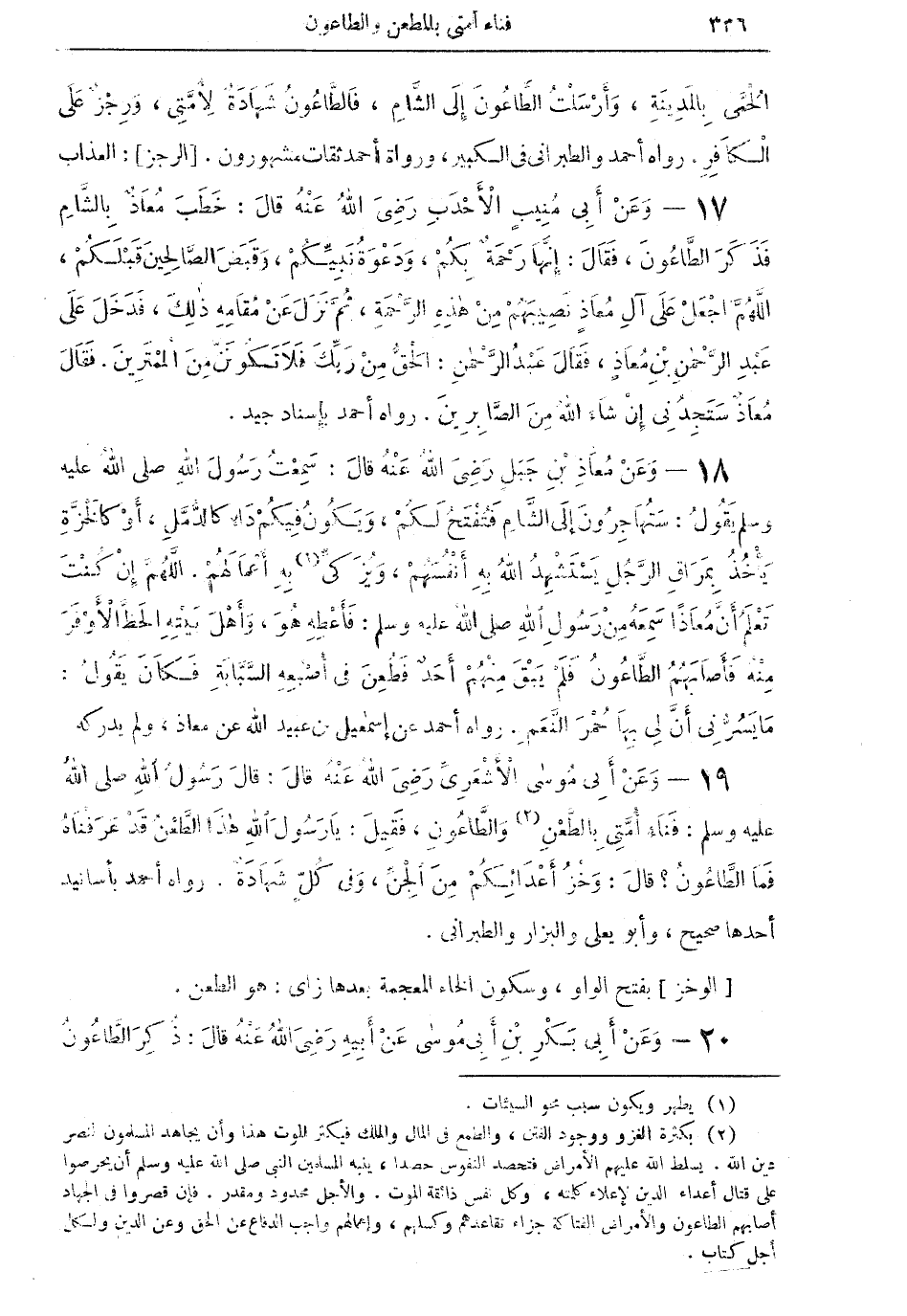19 - وَعَن أبي مُوسَى الْأَشْعَرِيّ رَضِي الله عَنهُ قَالَ قَالَ رَسُول الله صلى الله عَلَيْهِ وَسلم فنَاء أمتِي بالطعن (¬2) والطاعون فَقيل يَا رَسُول الله هَذَا الطعْن قد عَرفْنَاهُ فَمَا الطَّاعُون قَالَ وخز أعدائكم من الْجِنّ وَفِي كل شَهَادَة