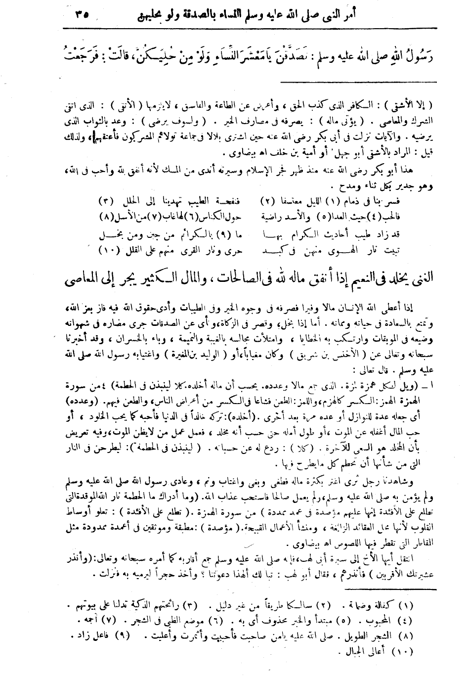 وشاهدنا رجل ثري اغتر بكثرة ماله وبغى واغتاب ونم، وعادى رسول الله صلى الله عليه وسلم، ولم يؤمن به صلى الله عليه وسلم، ولم يعمل صالحا فاستحق عذاب الله. (وما أدراك ما الحطمة نار الله الموقدة التي تطلع على الأفئدة إنها عليهم مؤصدة في عمد ممدة) من سورة الهمزة. (تطلع على الأفئدة): تعلو أوساط القلوب لأنها محل العقائد الزائغة، ومنشأ الأعمال القبيحة. (مؤصدة): مطبقة وموثقين في أعمدة ممدة مثل المقاصرة التي تقطر فيها اللصوص أهـ بيضاوي.