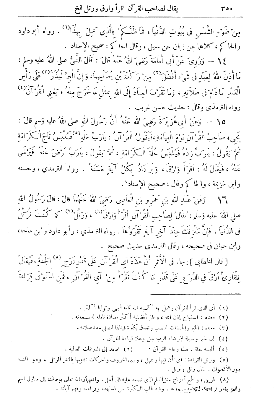 16 - وعن عبد الله بن عمرو بن العاص رضي الله عنهما قال: قال رسول الله صلى الله عليه وسلم: يقال لصاحب القرآن اقرأ وارق (¬6)، ورتِّل (¬7) كما كنت ترتل في الدنيا، فإنَّ منزلك عند آخر آيةٍ تقرؤها. رواه الترمذي، وأبو داود وابن ماجه، وابن حبان في صحيحه، وقال الترمذي حديث حسن صحيح.