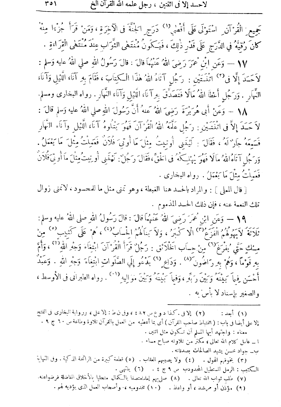 17 - وعن ابن عمر رضي الله عنهما قال: قال رسول الله صلى الله عليه وسلم: لا حسد إلا في (¬2) اثنتين: رجل آتاه الله هذا الكتاب، فقام به آناء الليل وآناء النَّهار. ورجل أعطاه الله مالا فتصدَّق به آناء الليل وآناء النَّهار. رواه البخاري ومسلم.
