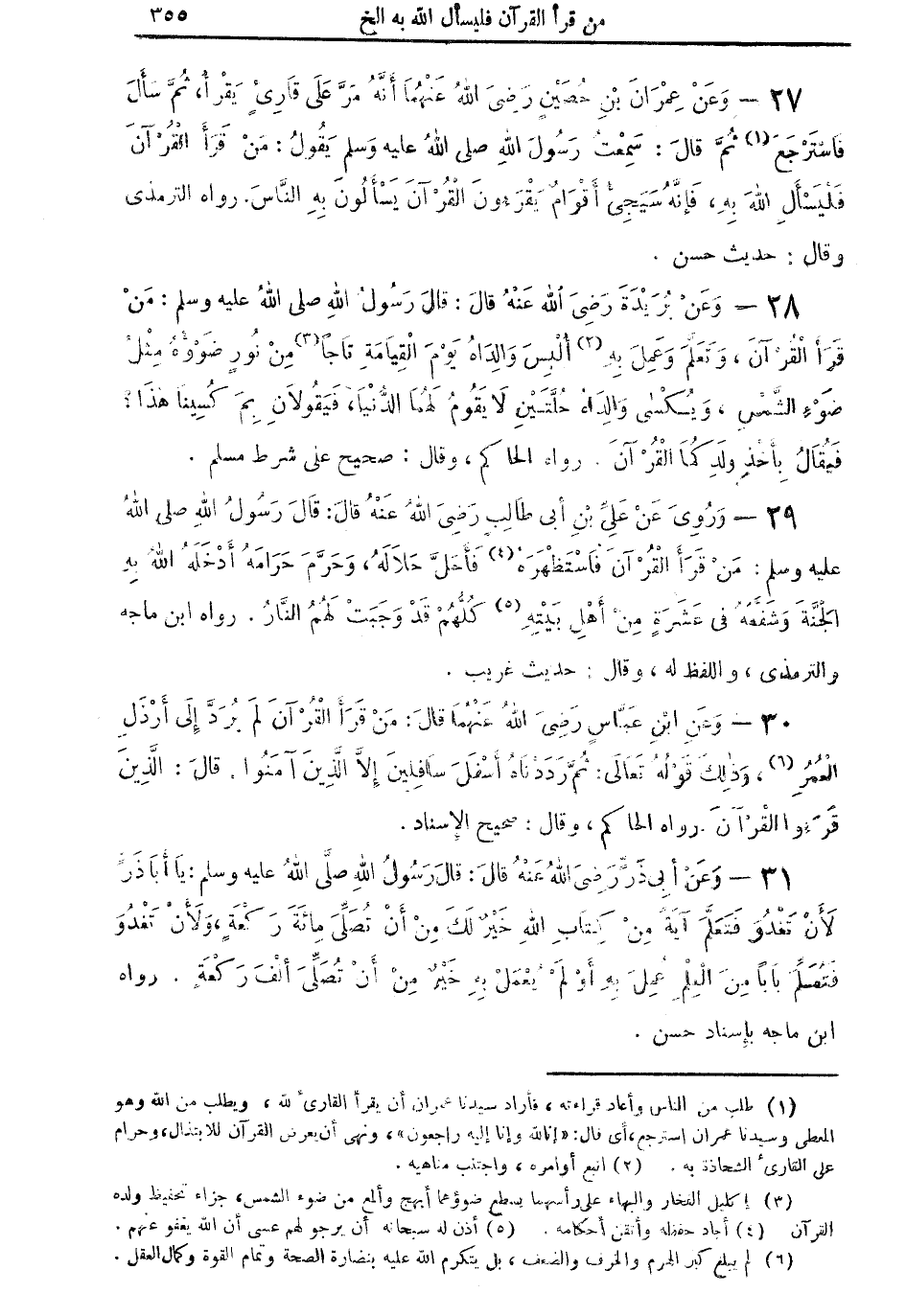 29 - وروي عنْ عليِّ بن أبي طالب رضي الله عنه قال: قال رسول الله صلى الله عليه وسلم: من قرأ القرآن فاستظهره (¬4) فأحلَّ حلاله، وحرَّم حرامه أدخله الله به الجنَّة وشفَّعه في عشرةٍ من أهل بيته (¬5) كلُّهمْ قد وجبت لهمُ النار. رواه ابن ماجه والترمذيّ، واللفظ له، وقال: حديث غريب.